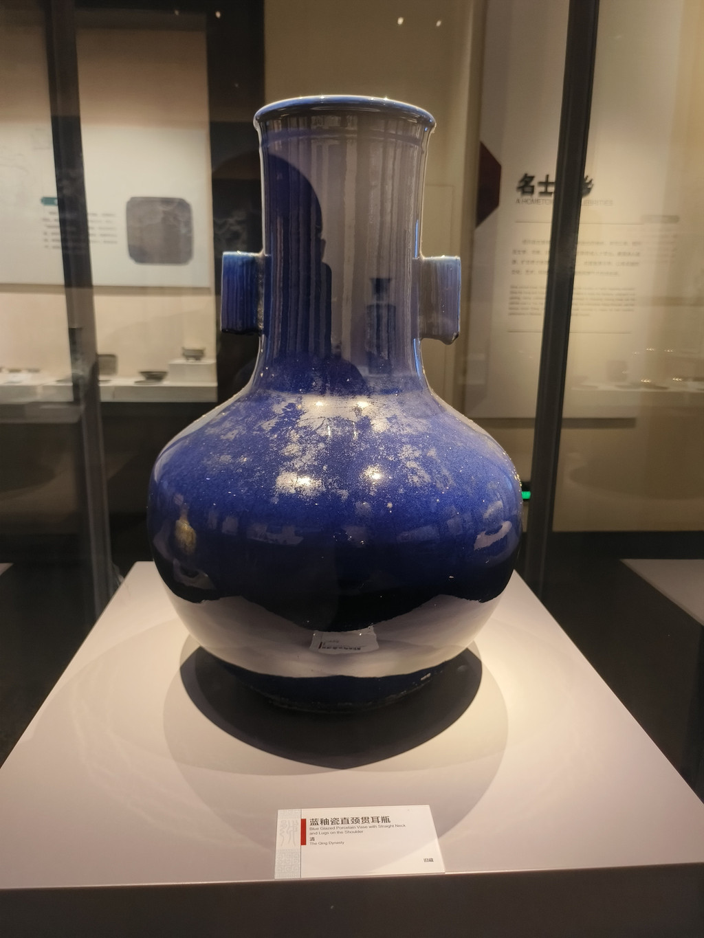 蓝釉瓷直颈贯耳瓶(清)。贯耳瓶的造型来源于汉代投壶式样,直颈较长,腹部扁圆,颈部两侧对称贴竖直的管状贯耳。