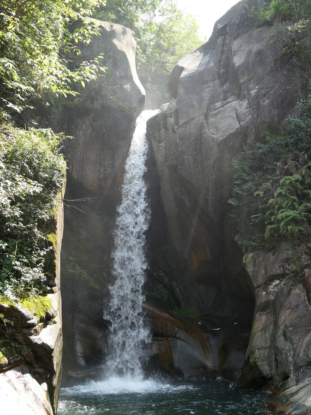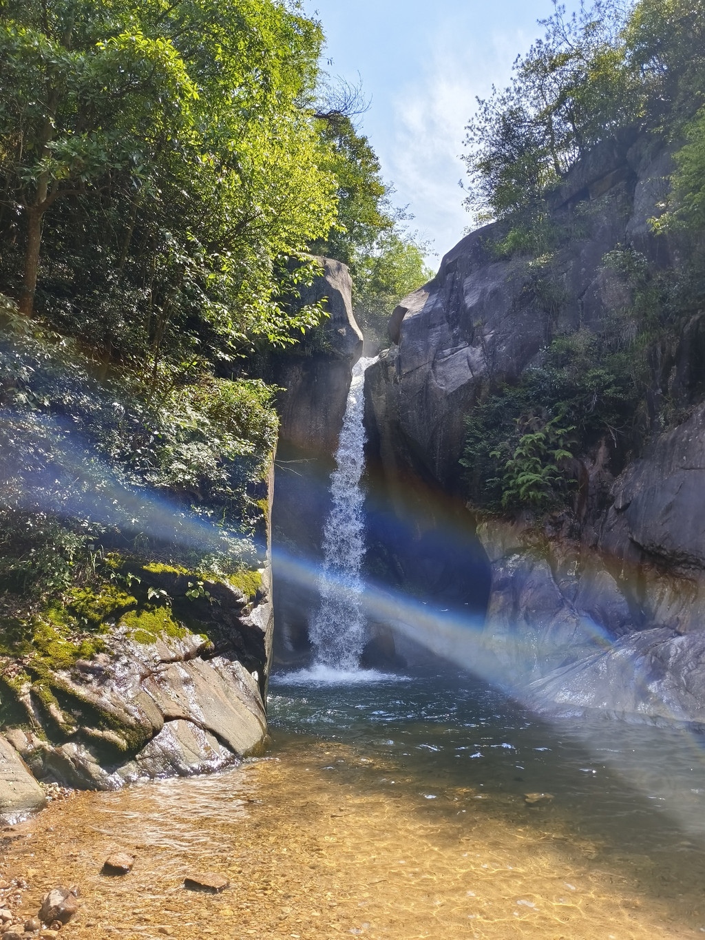 小铜壶瀑布。瀑水从形似壶嘴的岩隙中喷出,注入深渊,形成一泓碧潭,宛如古代计时工具铜壶滴漏。壶壁岩石光滑,两边的石头像两只猿猴在对饮。看,还有彩虹。