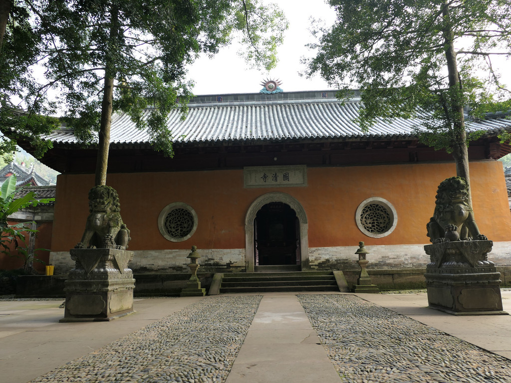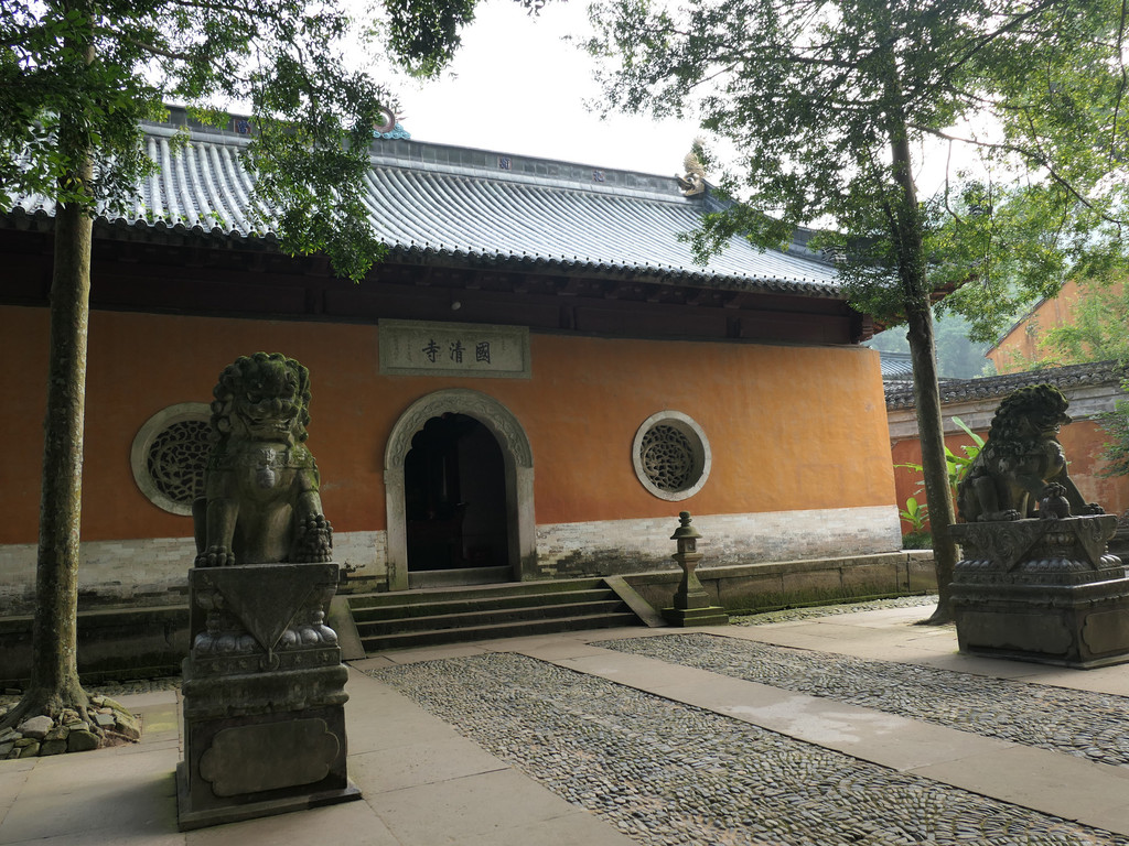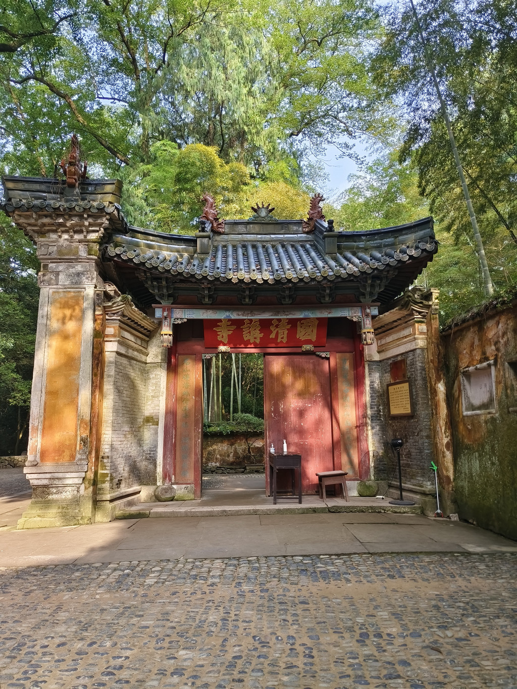 “国清讲寺”,红底金字,这是寺院的全名。一个“讲”字表明这里是讲经说法、研究佛礼的地方,区别于重修禅的“禅寺”、重清规戒律的“律寺”。