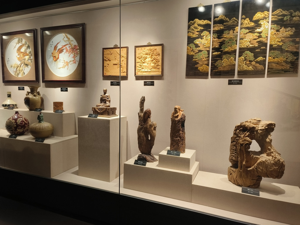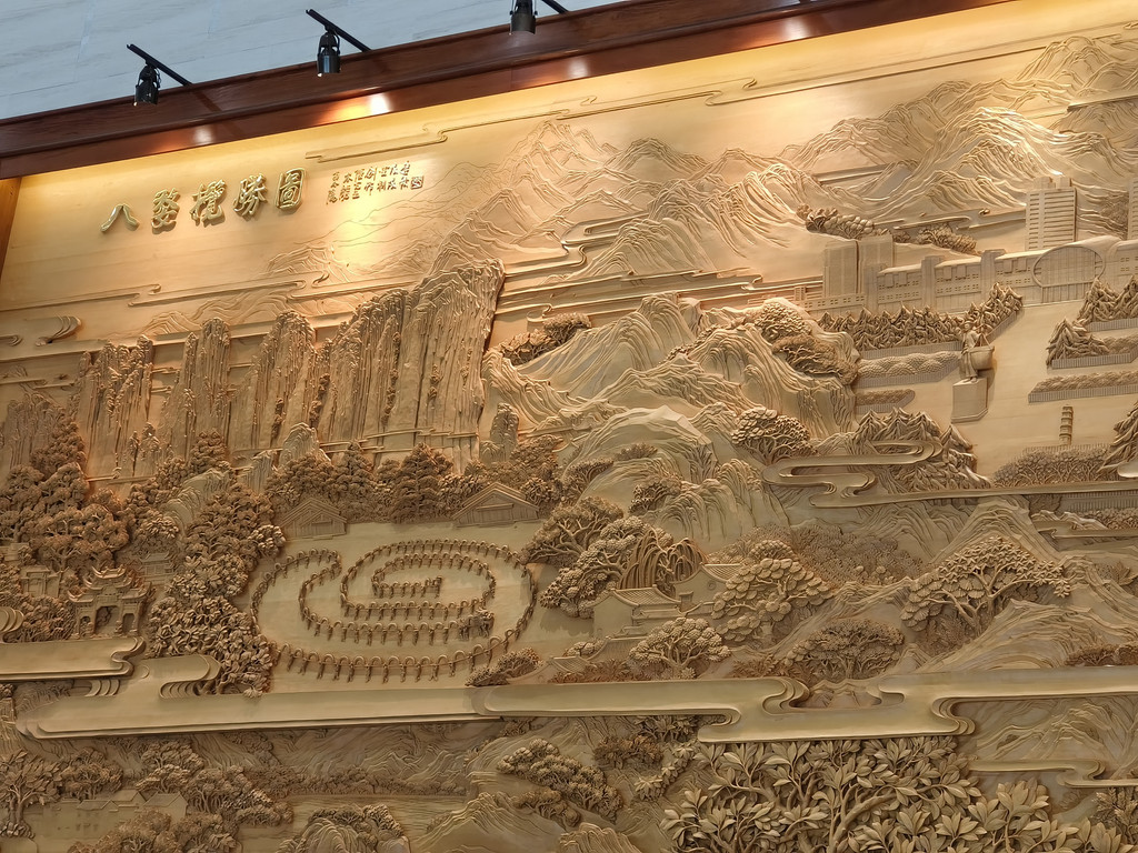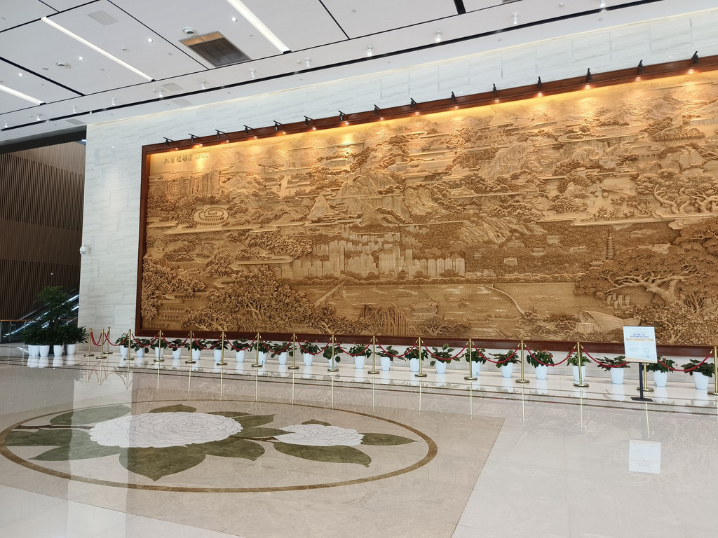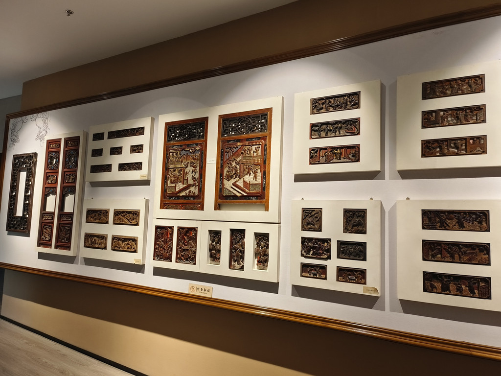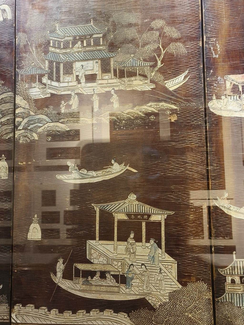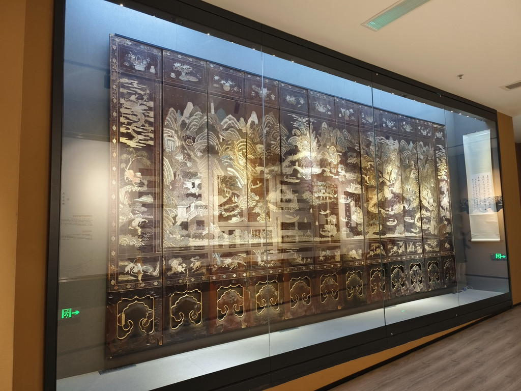 清康熙刻漆填彩西湖全景屏风。正面为西湖全景,由十二扇屏风组成,每扇宽45厘米,高270厘米,刻漆填彩,制作精细。背面有长篇铭文,记叙康熙年间天台人施留翁在福建从政期间,颇得好评,当地人士为其祝寿等内容。