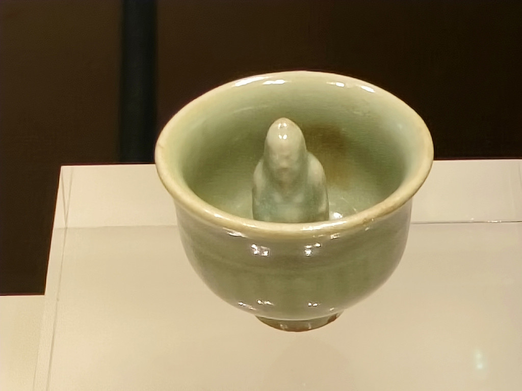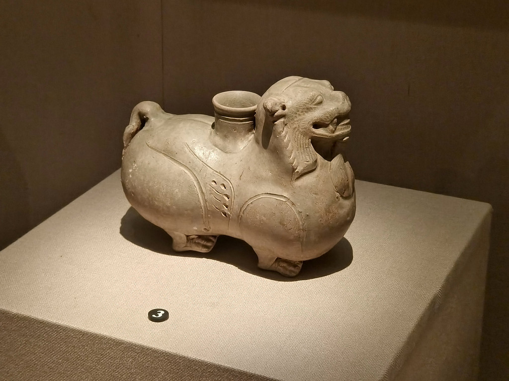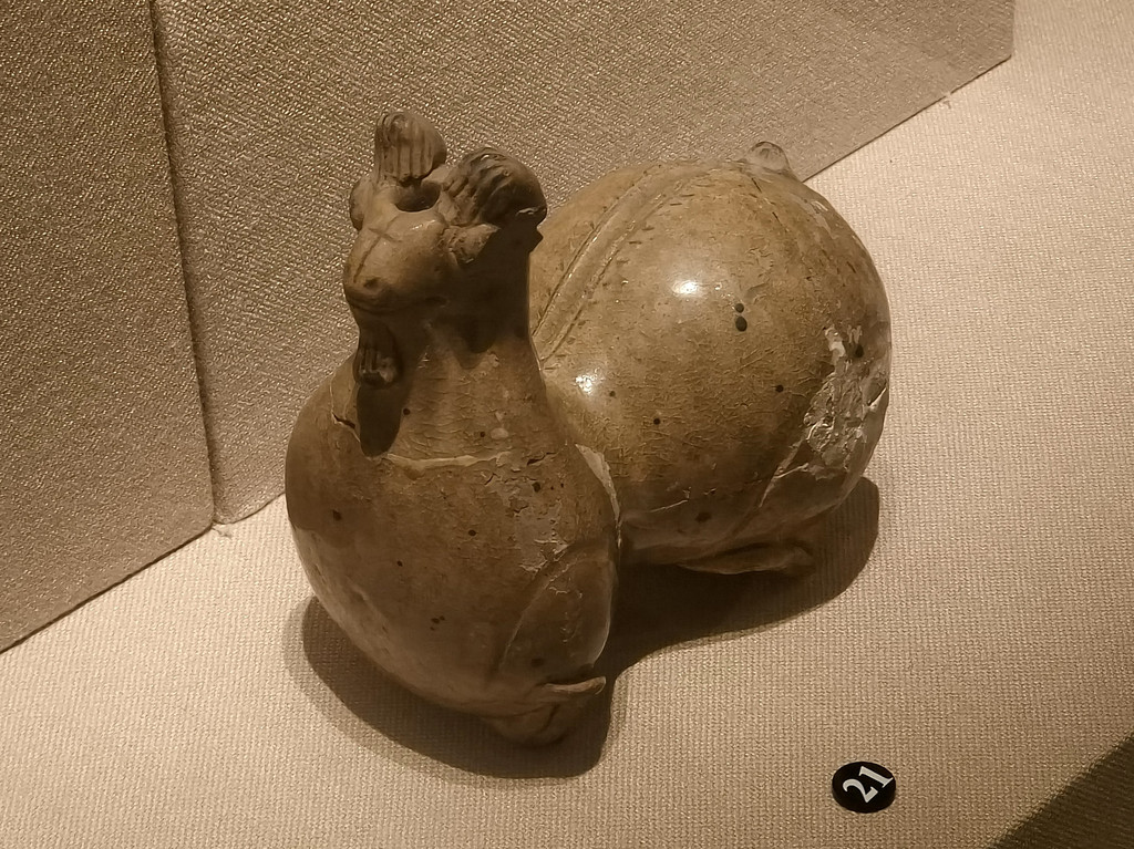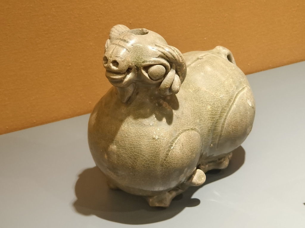青釉瓷羊形器(东晋)。宴饮和祭祀用酒器。羊呈跪伏状。大头短颈,头顶镂一小圆孔。卷角张口,神态安详。羊,通“祥”,是一种祥瑞动物。