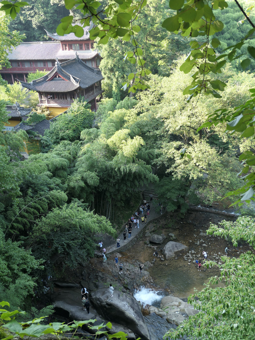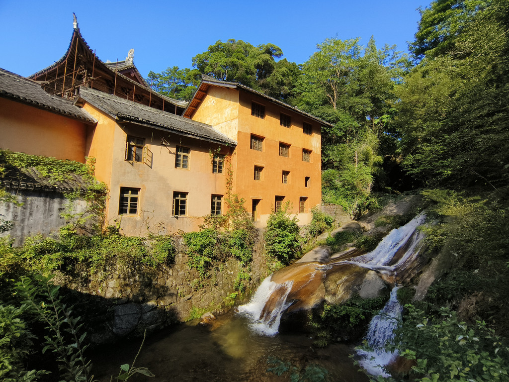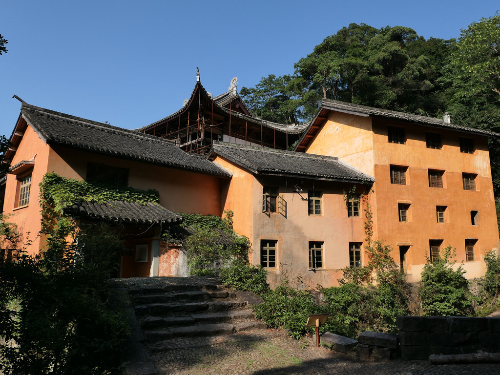 古方广寺,位于石梁飞瀑之下,是佛教五百罗汉道场。所谓道场,就是僧人修行的地方。这里依瀑布流向从山顶由上而下建有上、中、下三寺。山顶为上方广寺,飞瀑边上为中方广寺,飞瀑之下为古方广寺。方广寺最早由昙猷大师在东晋年间所建,初名石桥寺,后多次整修,现在所见为1983年重建。寺中禅语对联很有特色:风声,水声,虫声,鸟声,梵呗声,总合三百六十击钟鼓声,无声不寂;月色,山色,草色,树色,云霞色,更兼四万八千丈峰峦色,有色皆空。