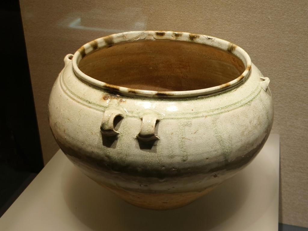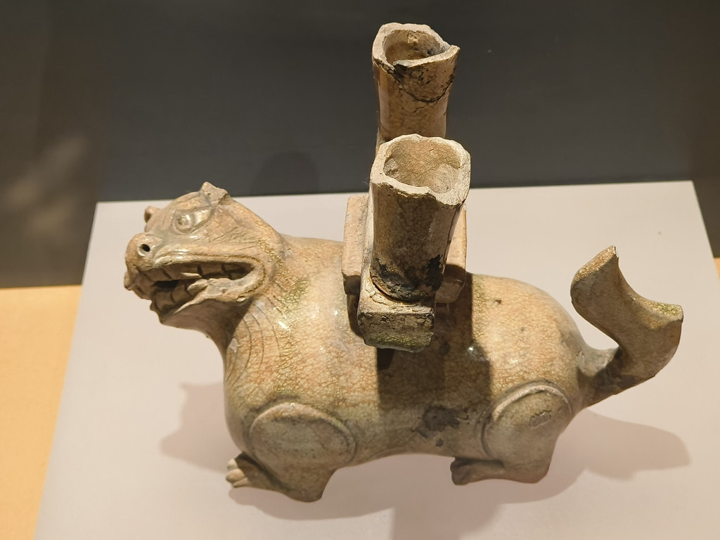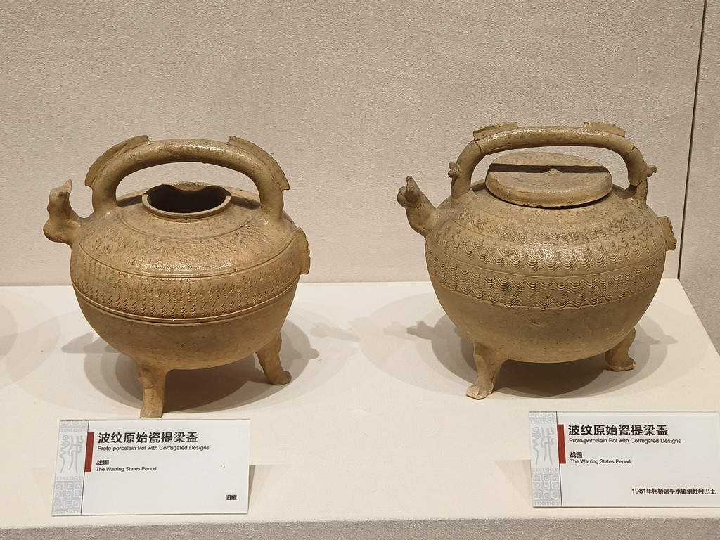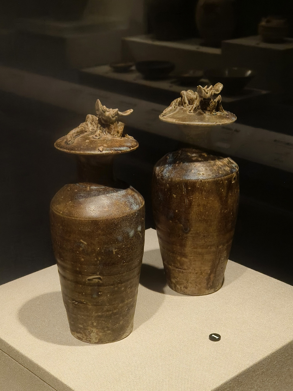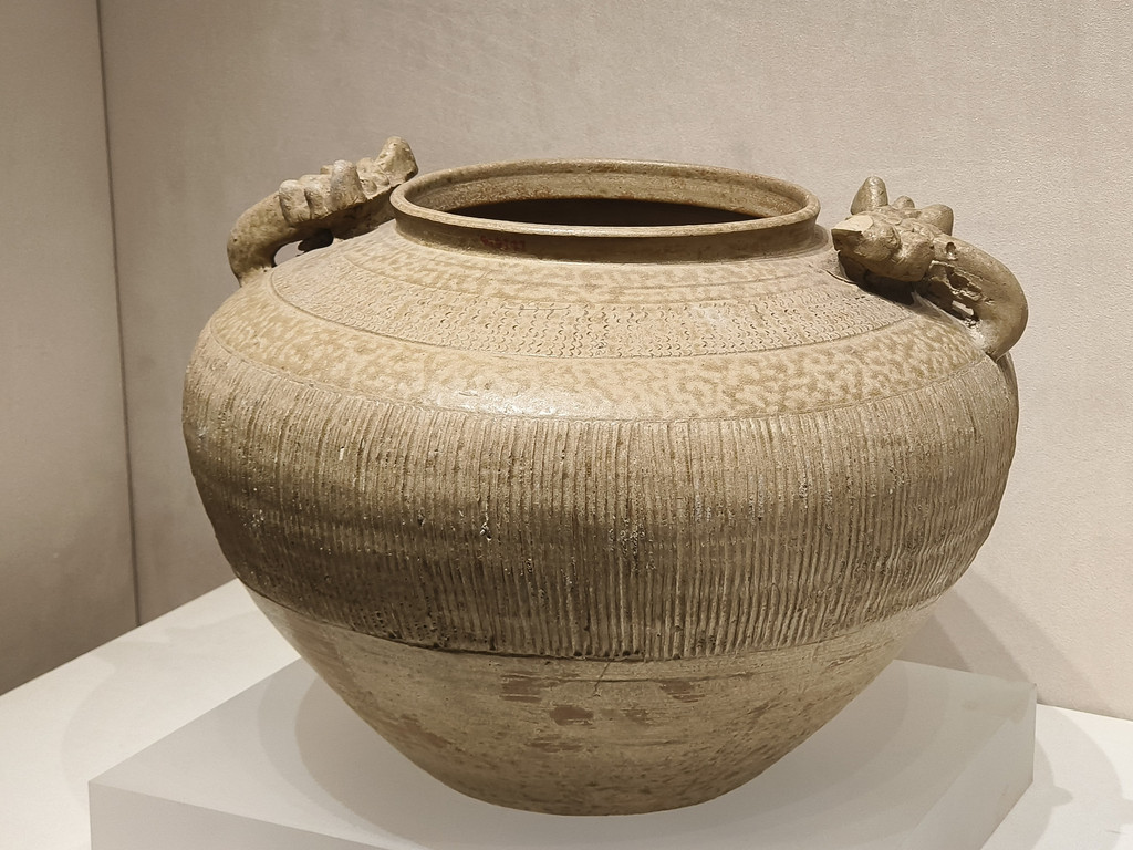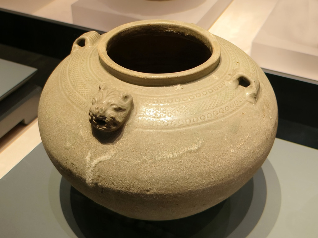 青釉瓷双系虎首罐(东晋)。宁绍地区的越窑青釉瓷是我国最早出现的青釉瓷器,有“母青瓷”之称。鼎盛时期的越窑青瓷胎质细腻,釉层均匀,色彩晶莹,质量上乘。