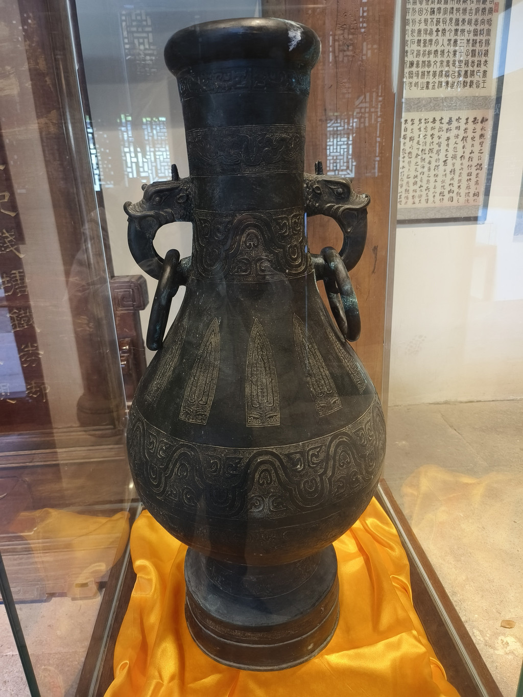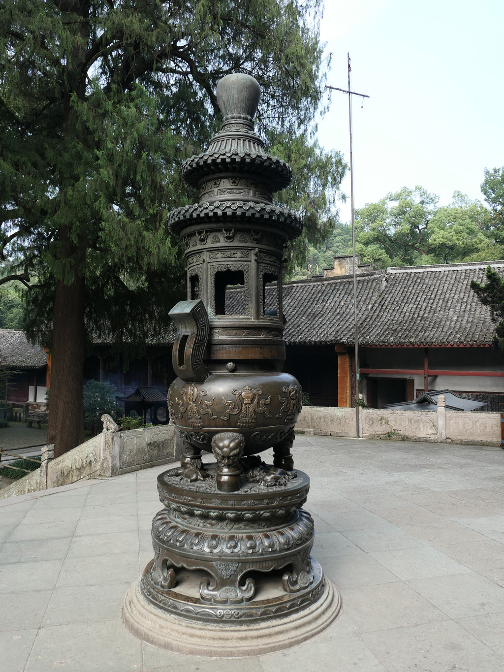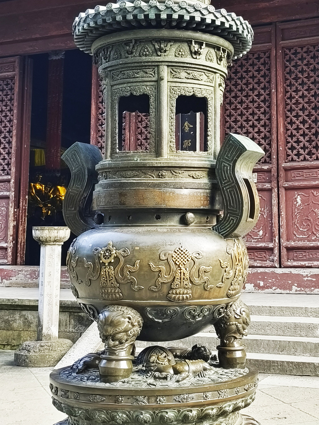 青铜鼎,清乾隆卅三年(1768)所铸,上书“圣寿无疆”。高3.8米,呈塔形,双耳三足,雕有三狮戏珠以及日月和法轮、法螺、宝伞、宝盖、莲花、宝瓶、金鱼、盘结八宝图。