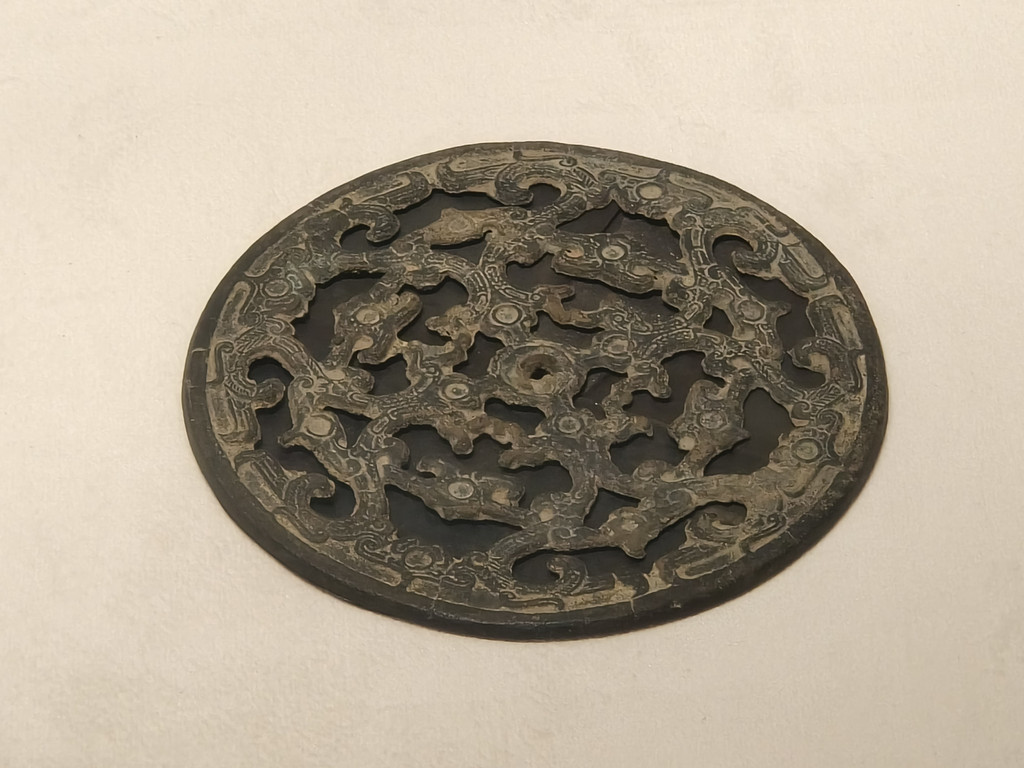 透雕凤鸟纹复合式铜镜(战国)。镜背以圆钮座为中心,作十字形等分为四个象限区,每区透雕一对相向凤鸟,各组凤鸟之间又以冠、颈、翅相互连接成整体图案。