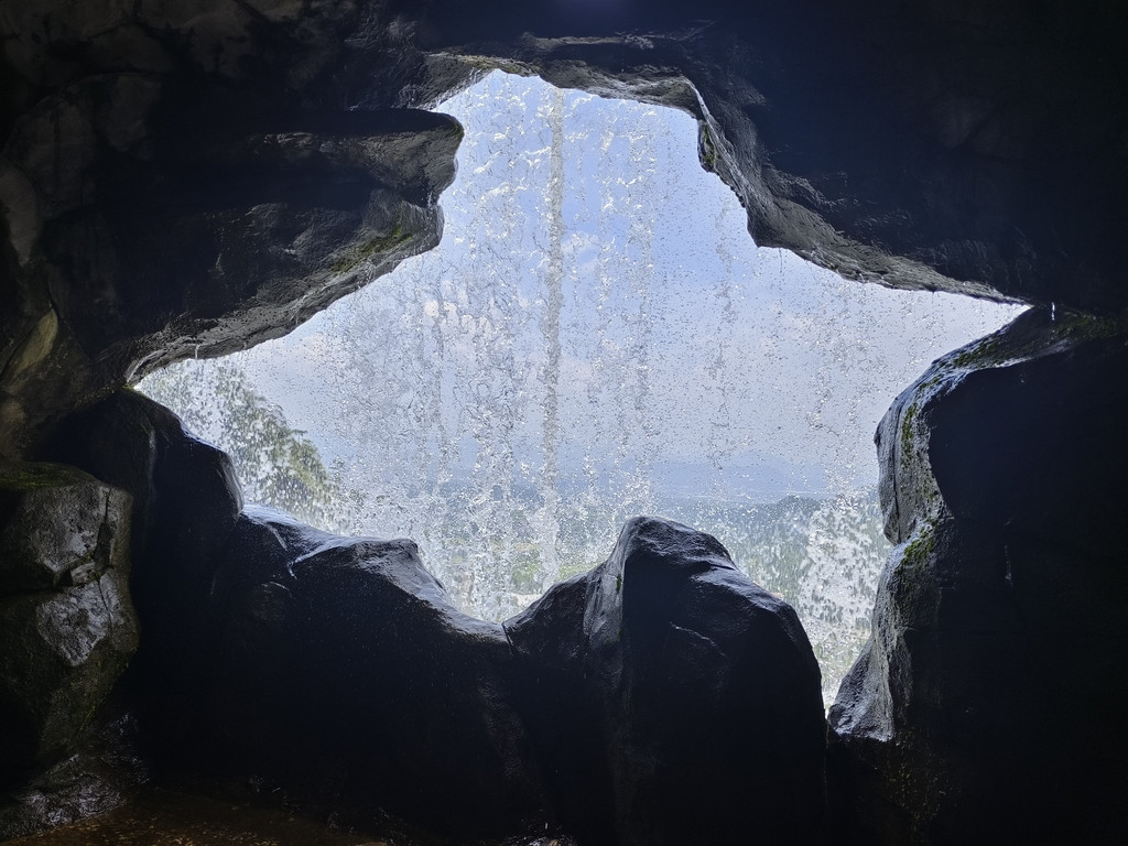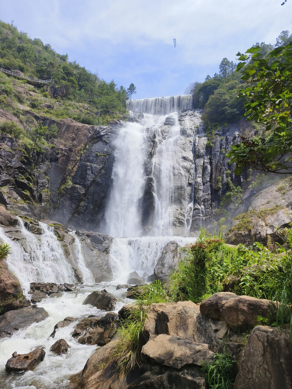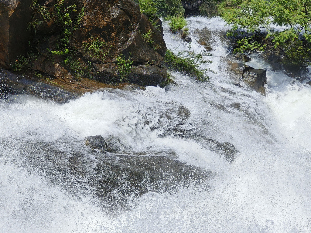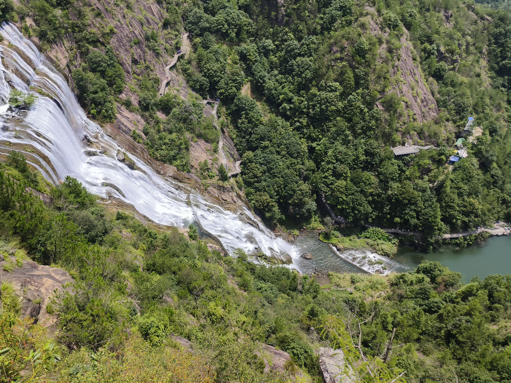 神龙掉尾,石梁瀑布群之一。上游之水在此激石上抛后陡然下降,就像白龙露出一截尾巴,故名。