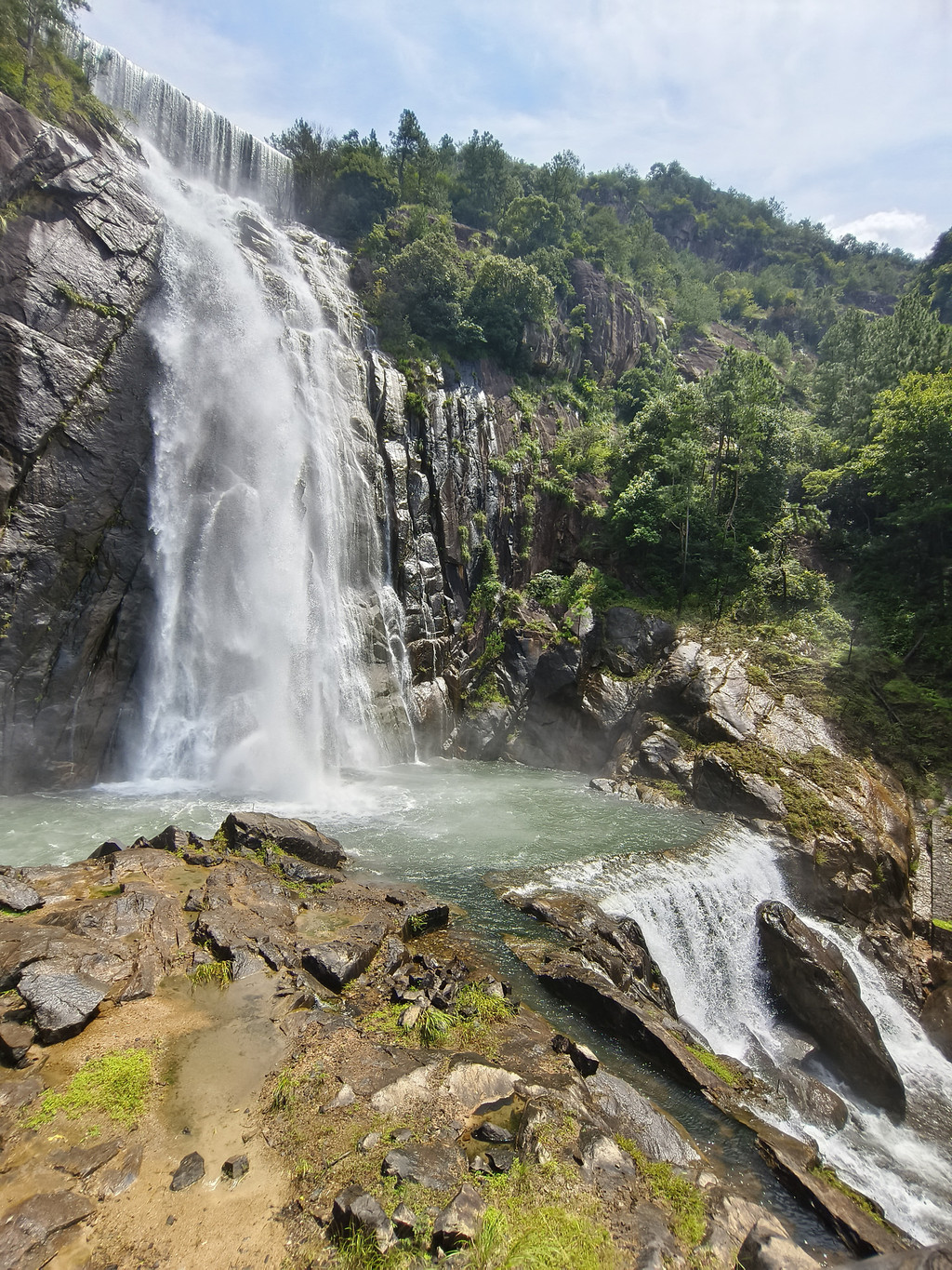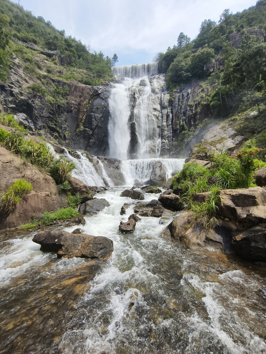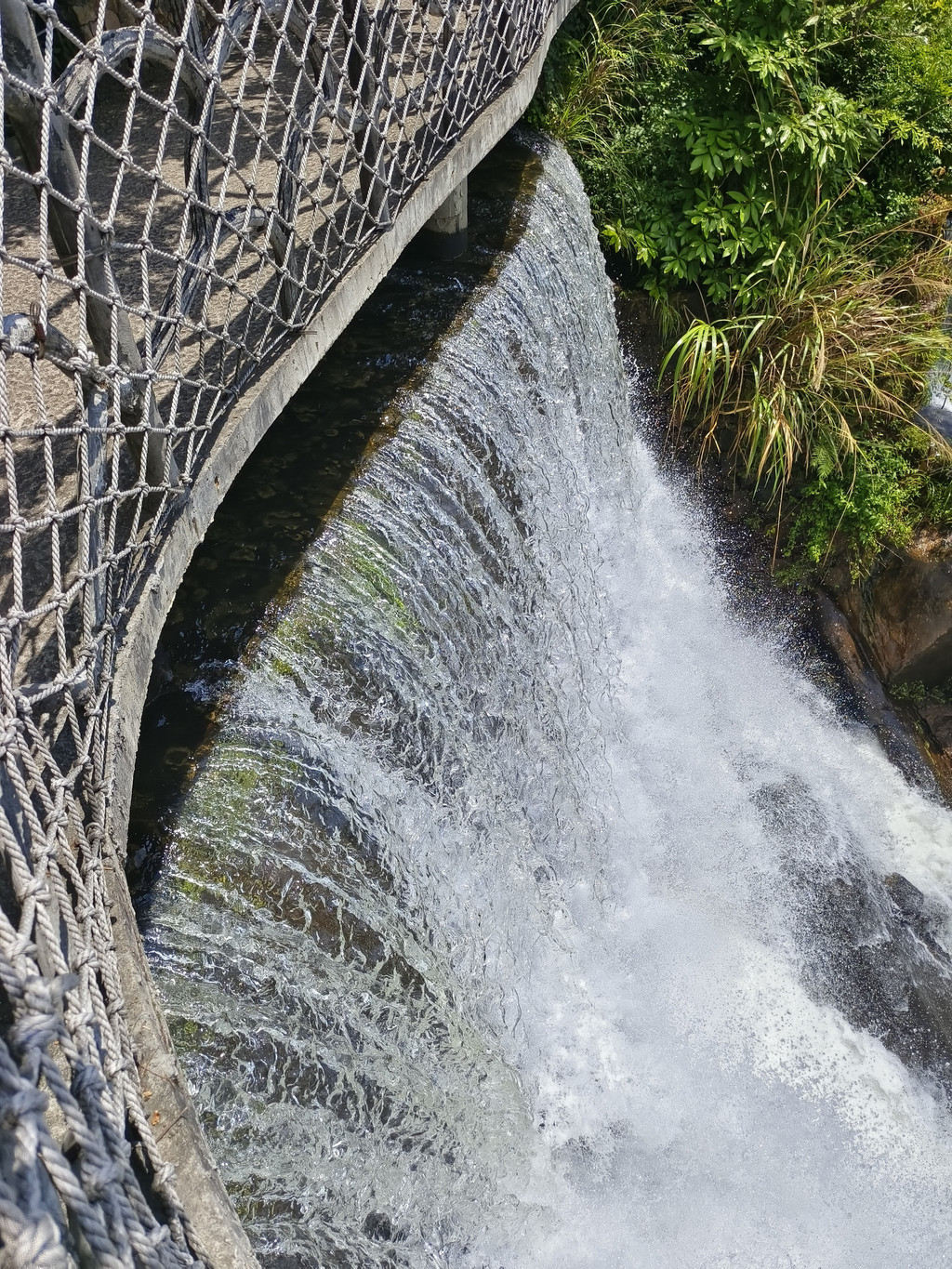 神龙掉尾,石梁瀑布群之一。上游之水在此激石上抛后陡然下降,就像白龙露出一截尾巴,故名。