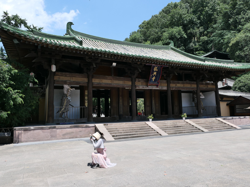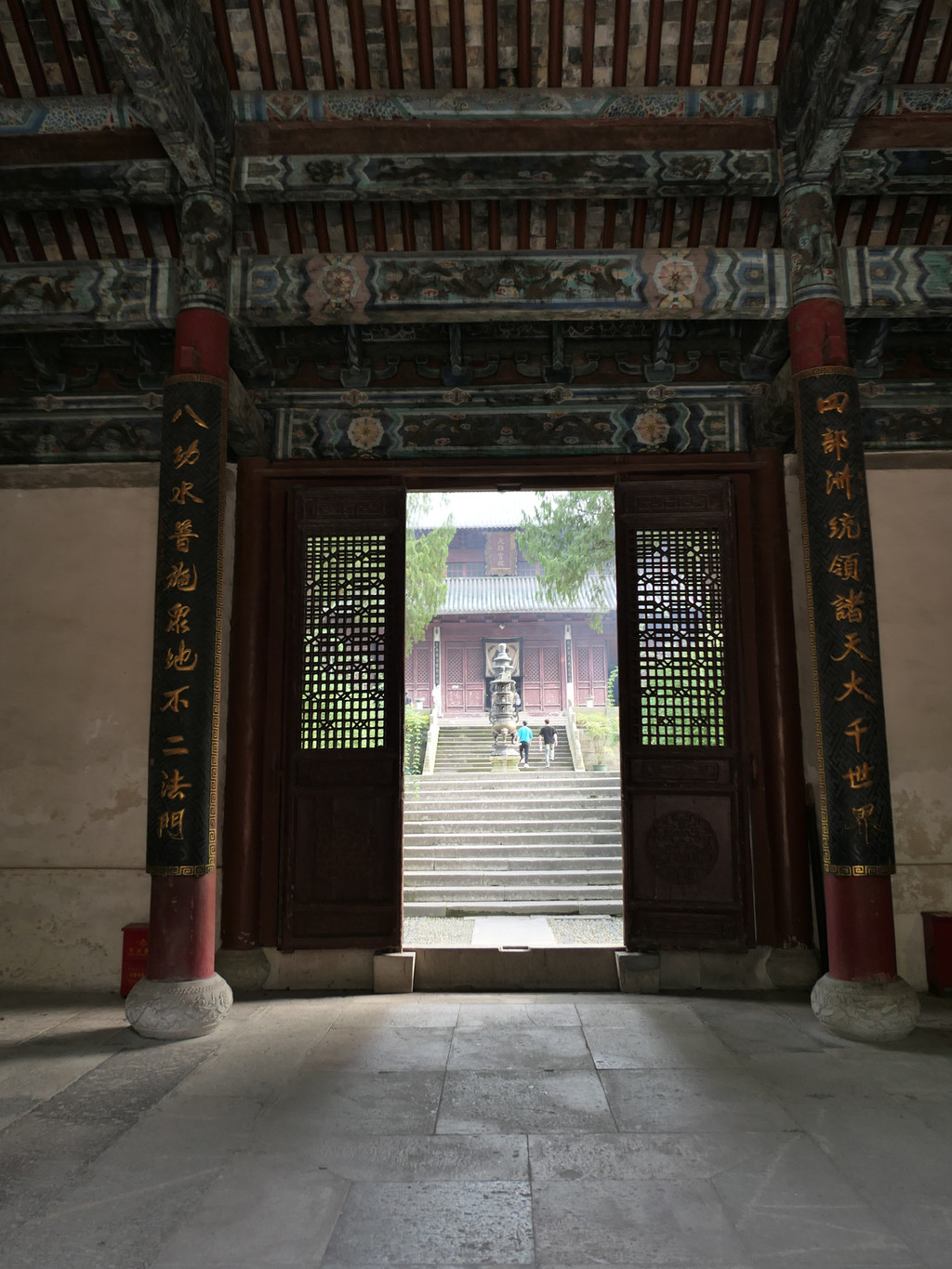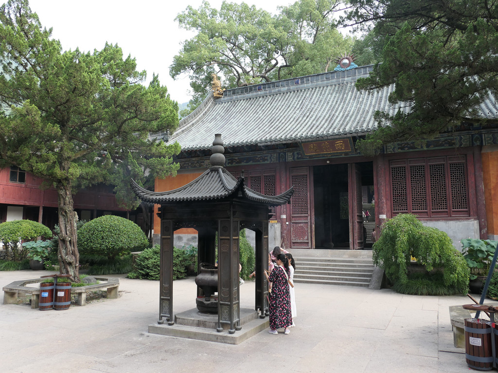 国清寺的布局是依山就势、层层递高,按四条南北轴线布列六百多间古建筑,正中轴由南而北依次为弥勒殿、雨花殿、大雄宝殿、药师殿、观音殿;还有放生池、钟鼓楼、聚贤堂、方丈楼、三圣殿、妙法堂等。上图为雨花殿,此名在其他佛寺中很难见到。相传天台宗祖师智者大师曾在此讲述《妙法莲花经》,精诚所至,感动天庭,下起法雨,故名。殿中供奉“四大天王”神像,又称“四天神”“四大金刚”,所以一般寺庙中此殿称为“金刚殿”或“天王殿”。