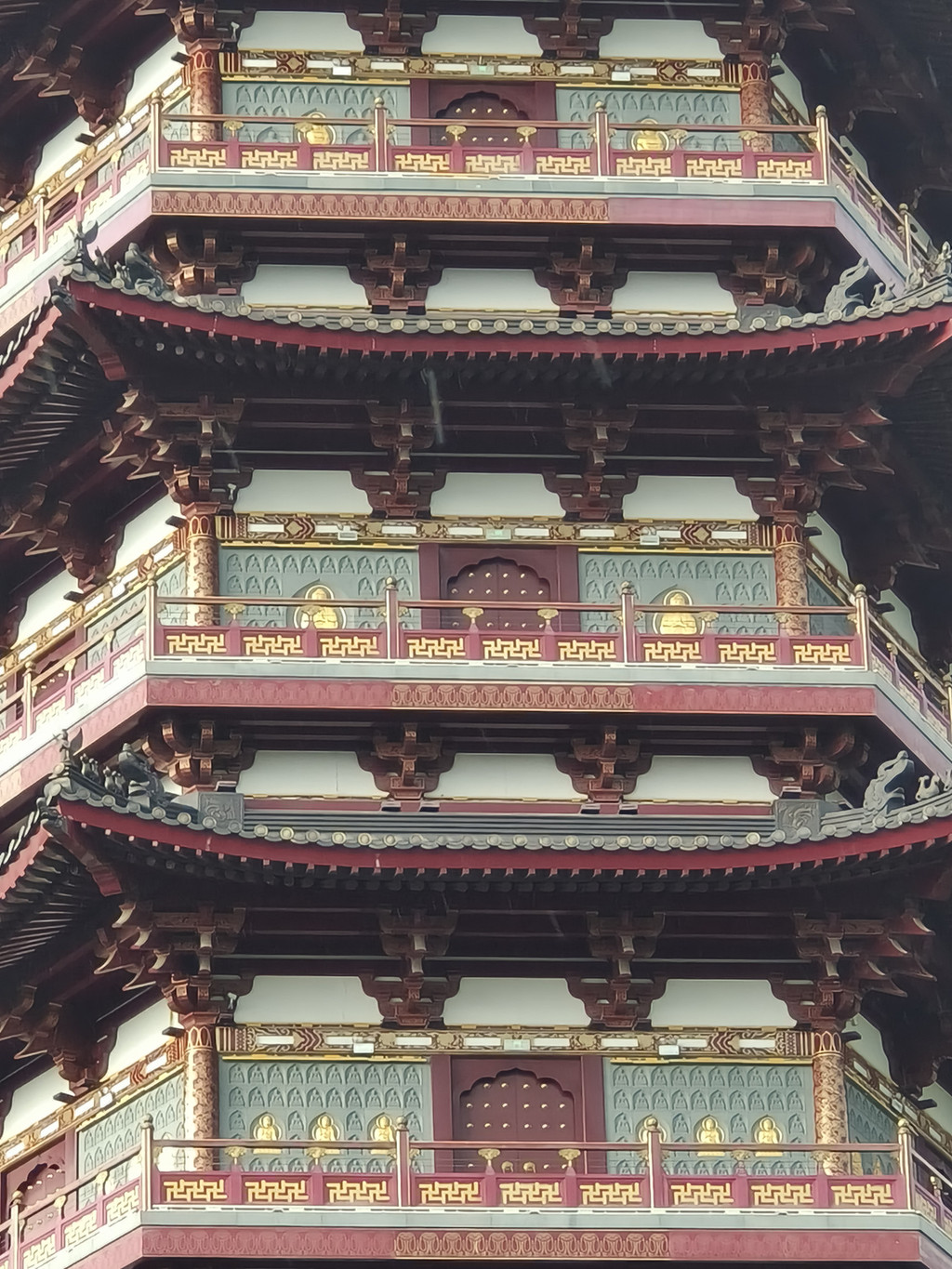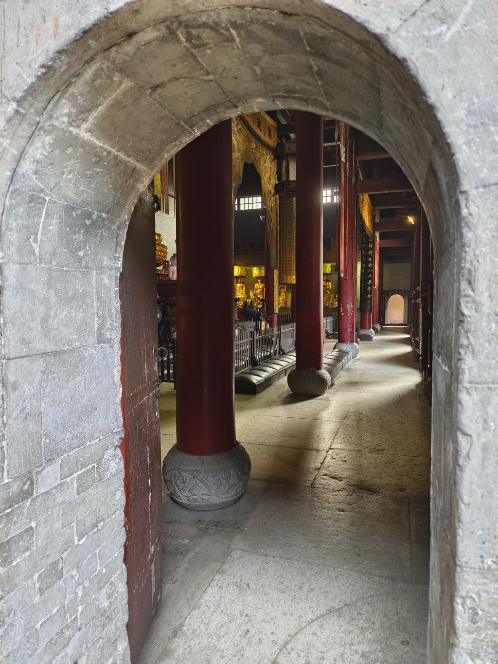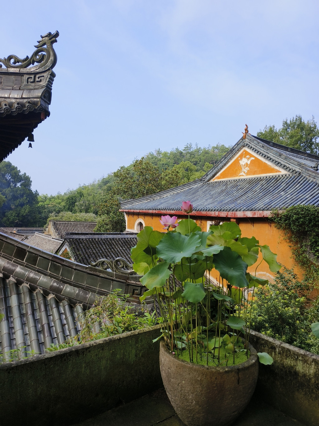 国清寺的布局是依山就势、层层递高,按四条南北轴线布列六百多间古建筑,正中轴由南而北依次为弥勒殿、雨花殿、大雄宝殿、药师殿、观音殿;还有放生池、钟鼓楼、聚贤堂、方丈楼、三圣殿、妙法堂等。上图为雨花殿,此名在其他佛寺中很难见到。相传天台宗祖师智者大师曾在此讲述《妙法莲花经》,精诚所至,感动天庭,下起法雨,故名。殿中供奉“四大天王”神像,又称“四天神”“四大金刚”,所以一般寺庙中此殿称为“金刚殿”或“天王殿”。