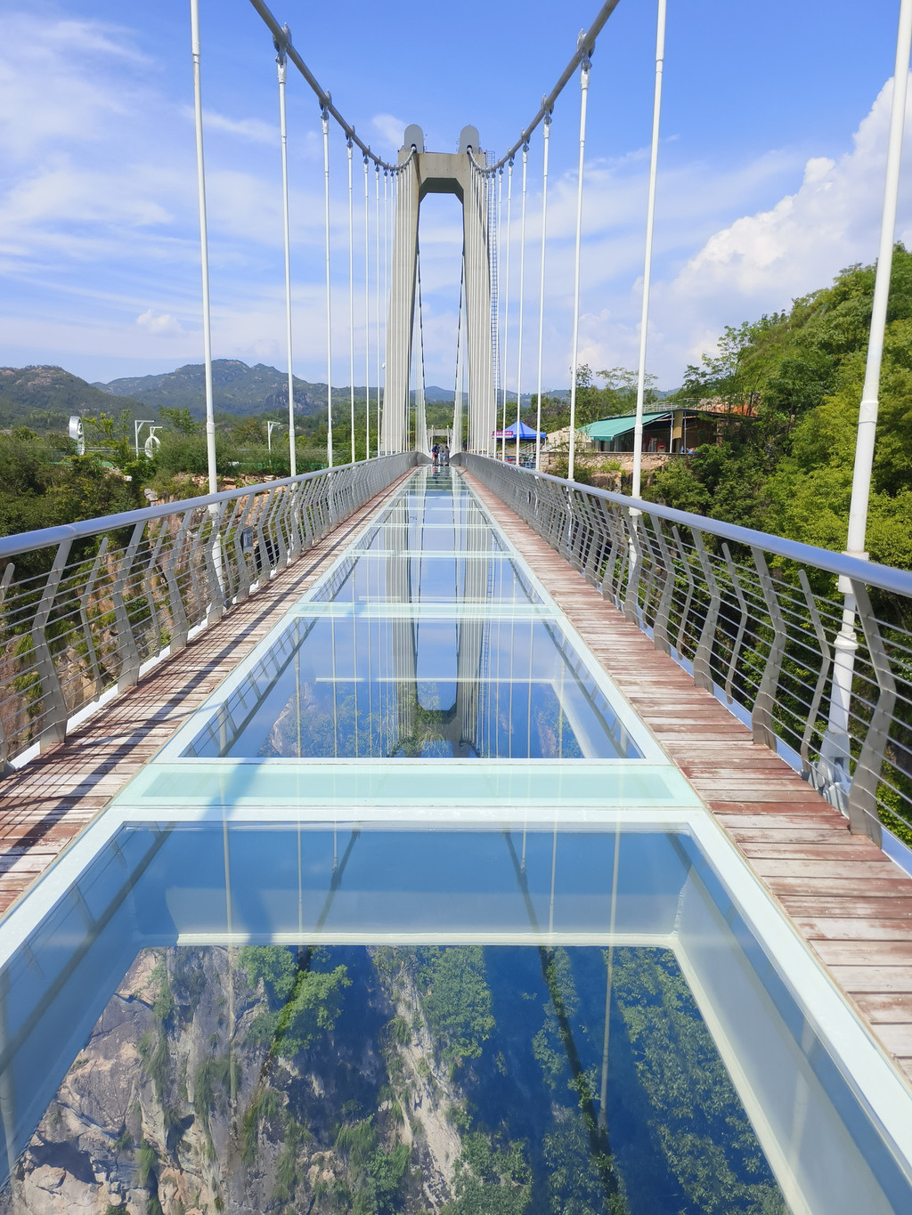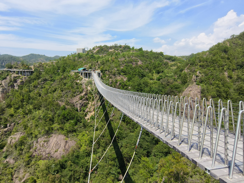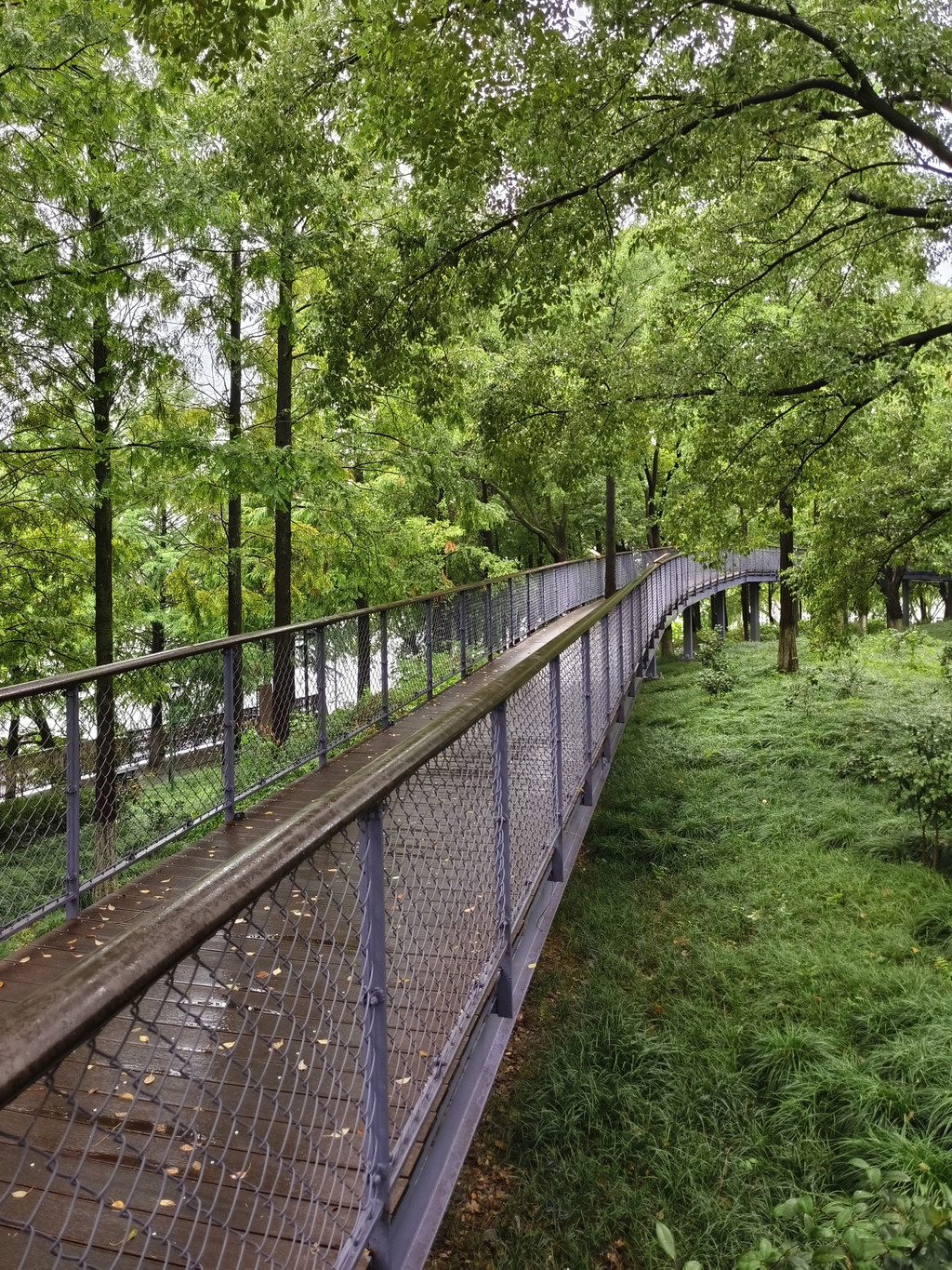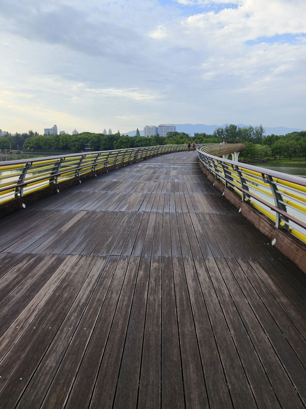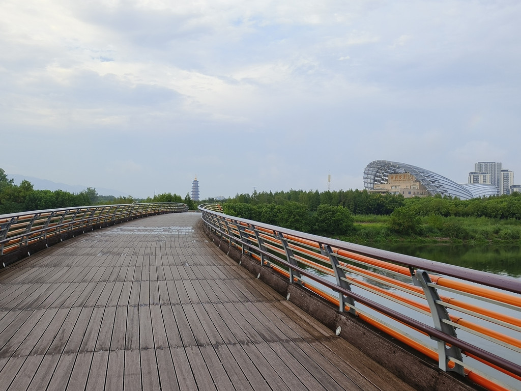 桥面铺设竹木地板,桥身采用红黄渐变色的透明玻璃钢管装饰。因造型优美、色彩艳丽、适合休闲健身,渐渐成为网红打卡点。