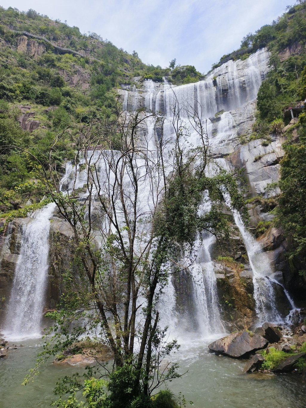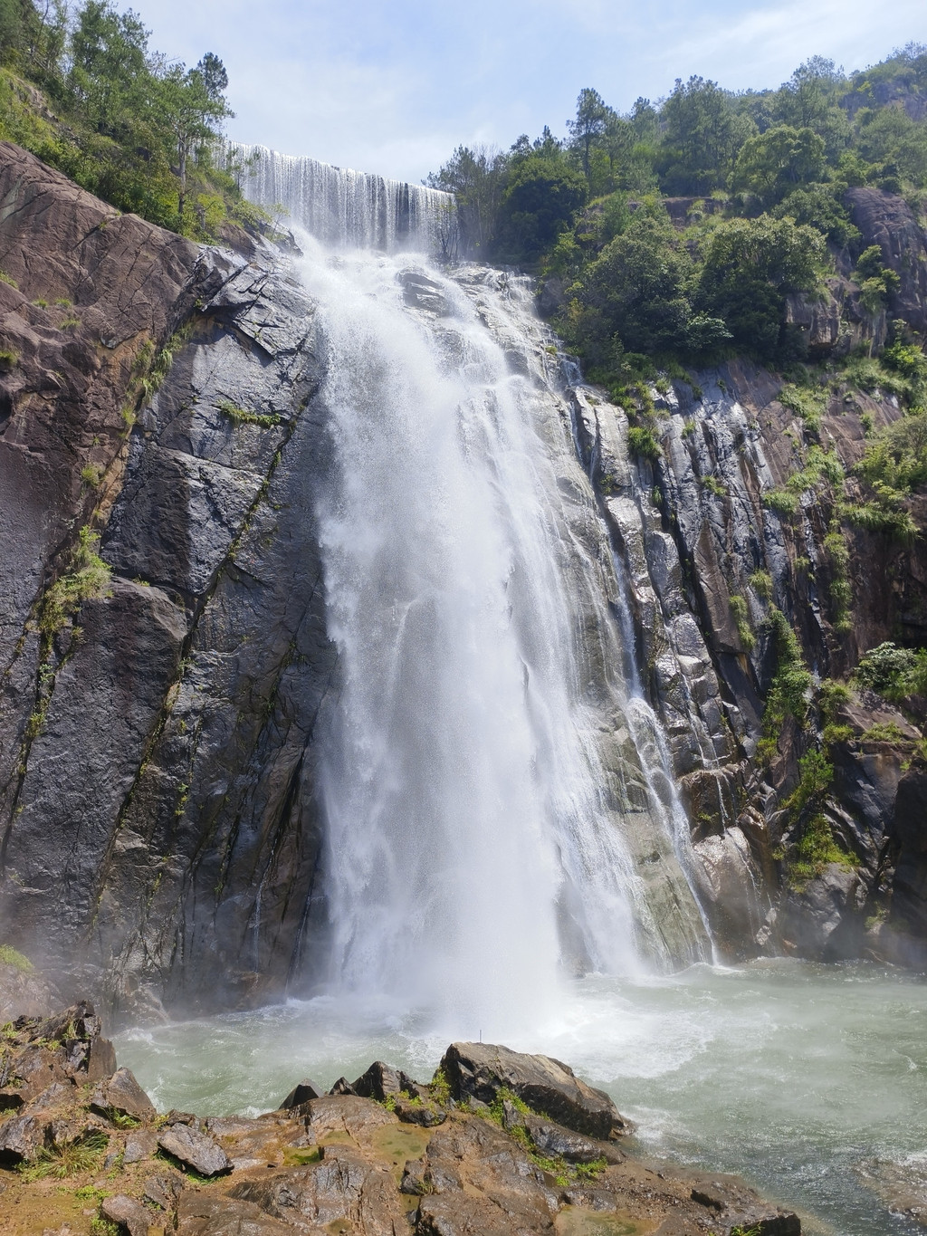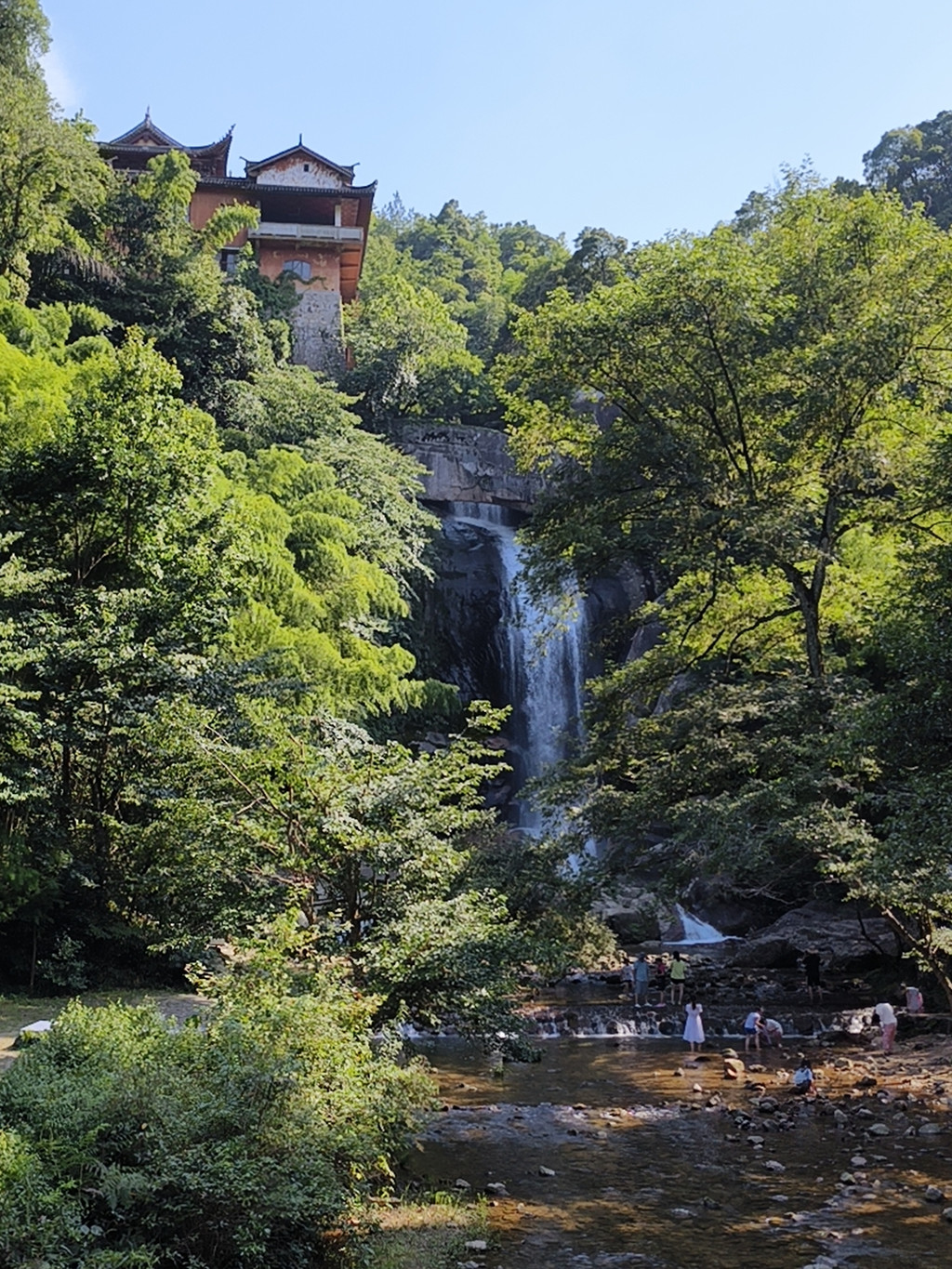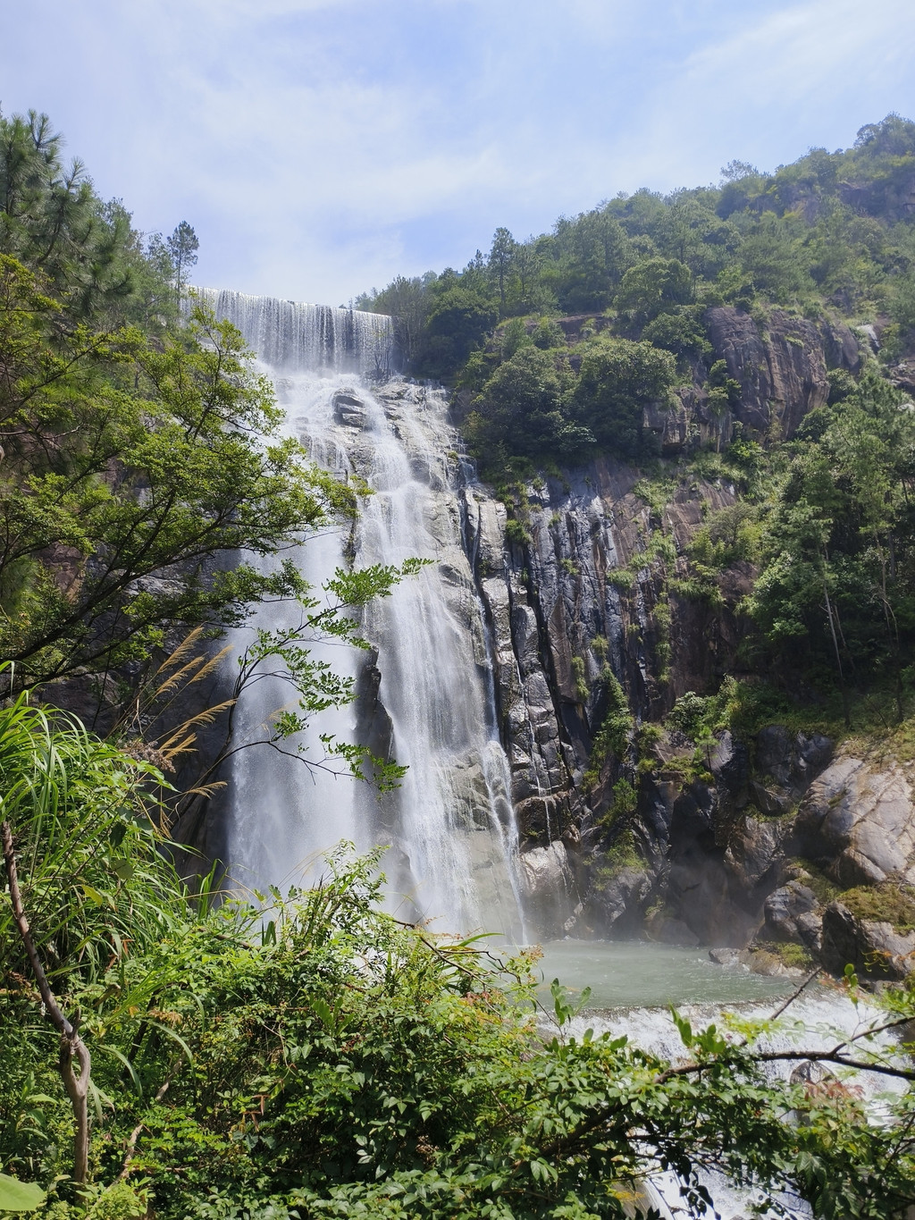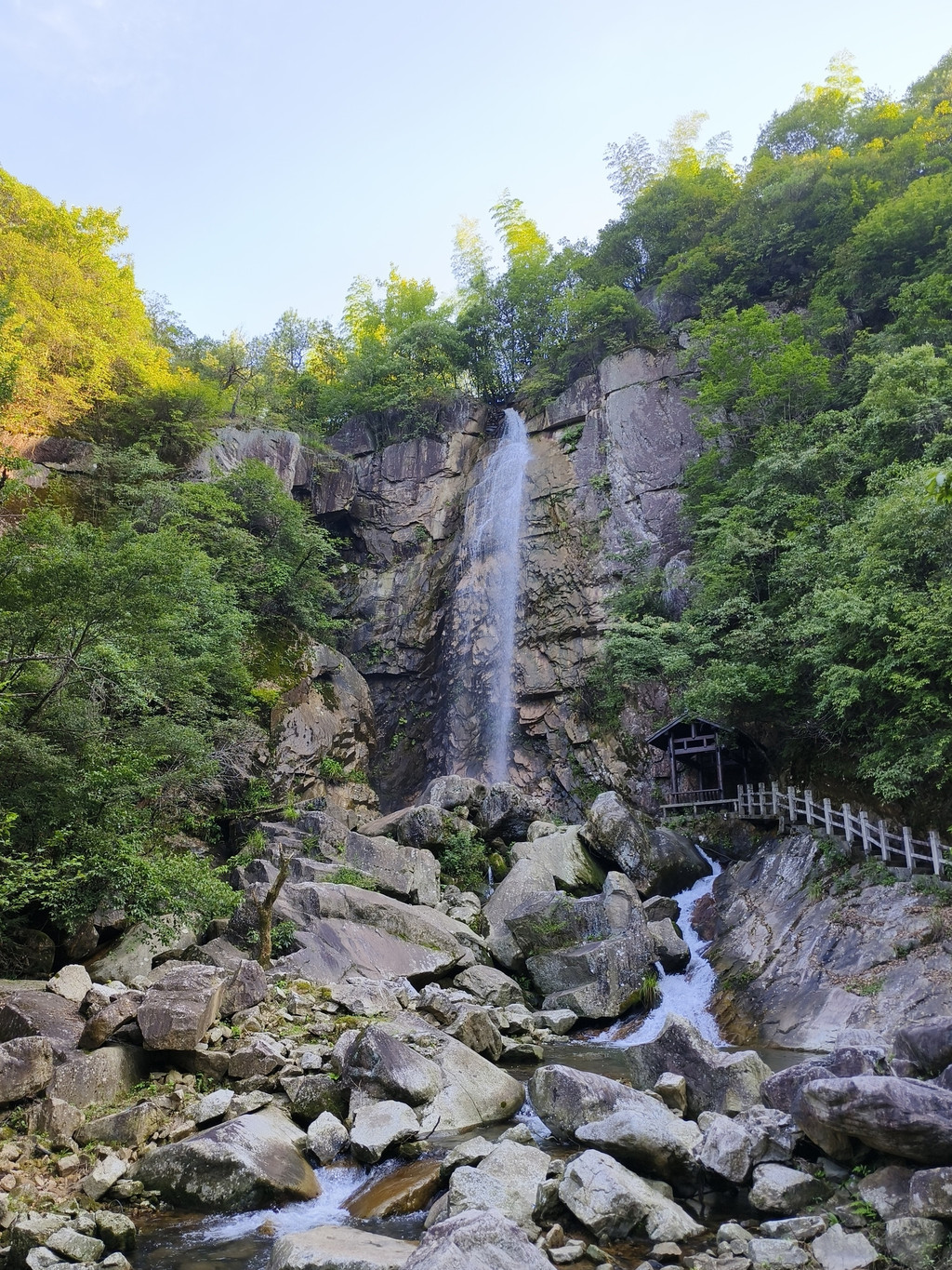 铗剑泉,高40多米,瀑水因两崖相挟,呼啸下坠,状如倚天长剑。