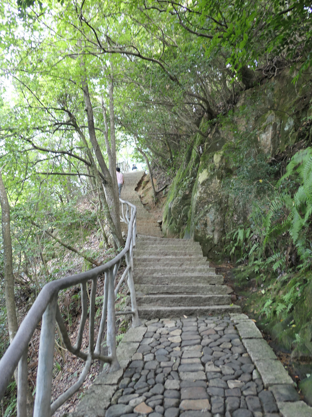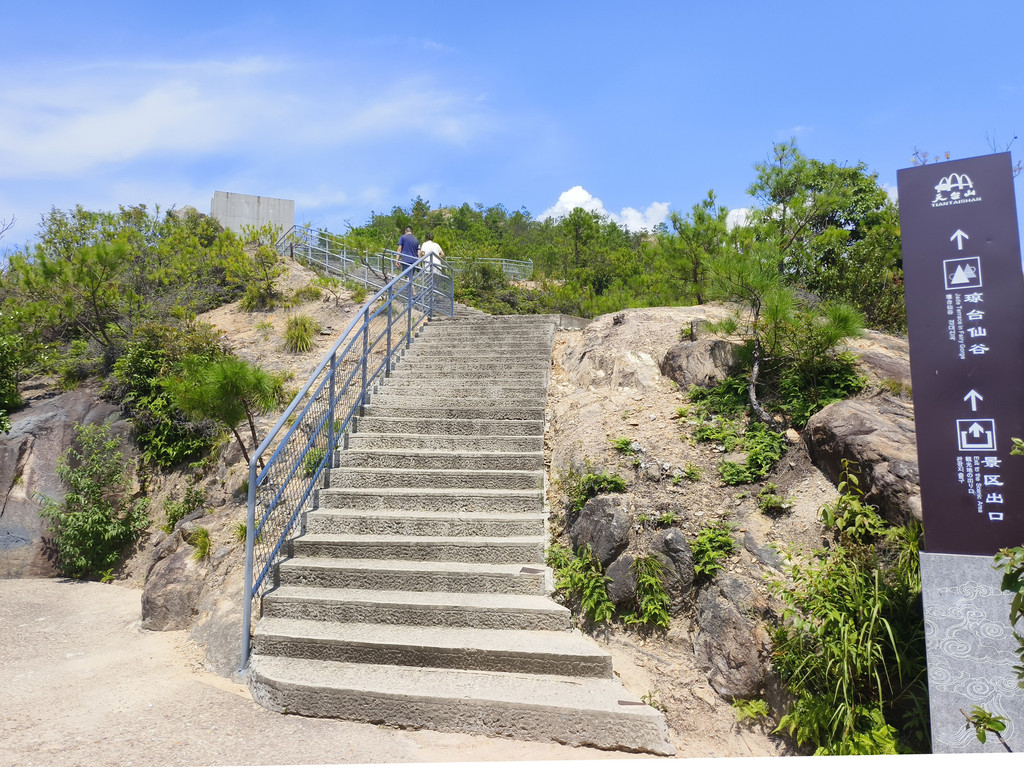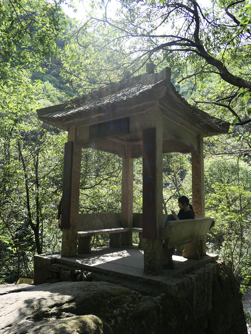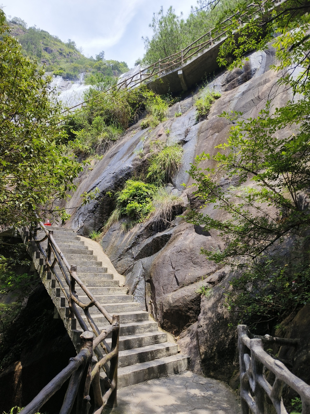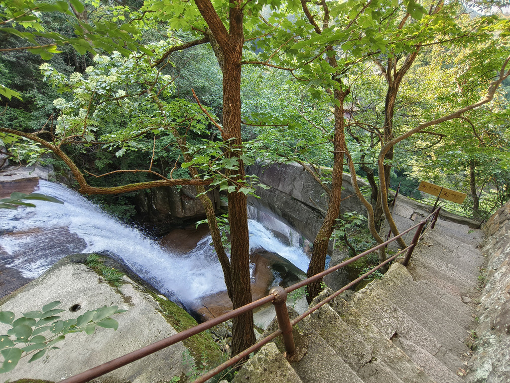 石梁景区的最后是一段长120米的山路,要一直向上攀爬,陡峭的台阶会让平时缺少锻炼的人感到吃力。返回游客中心的最后一趟班车是下午5点,所以要预留足够的时间,最晚4点半前要赶到铗剑泉。