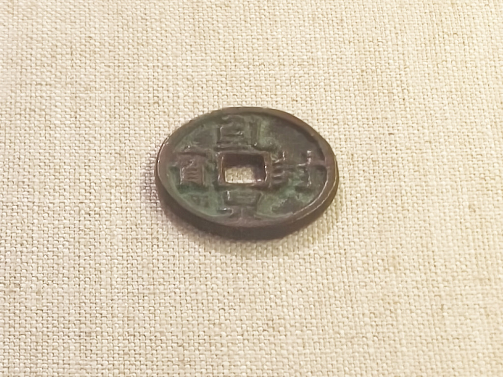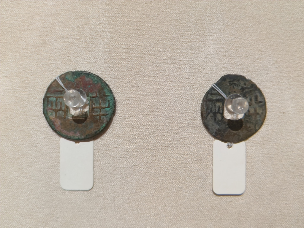 “半两”铜钱(秦)。秦国货币,沿用至汉初。圆形方孔的形状开创了历代钱币的形制。