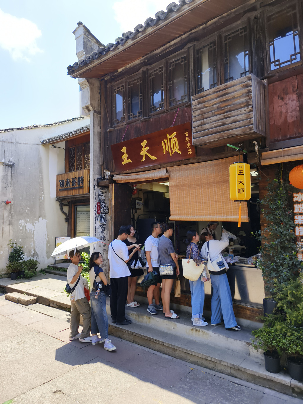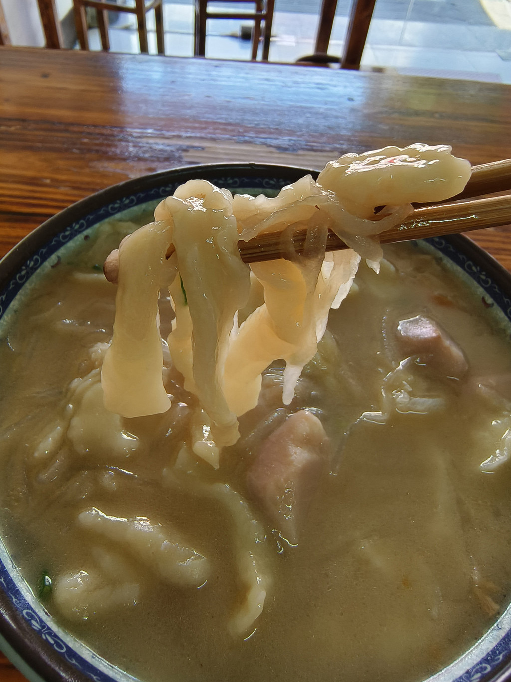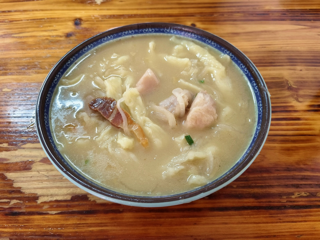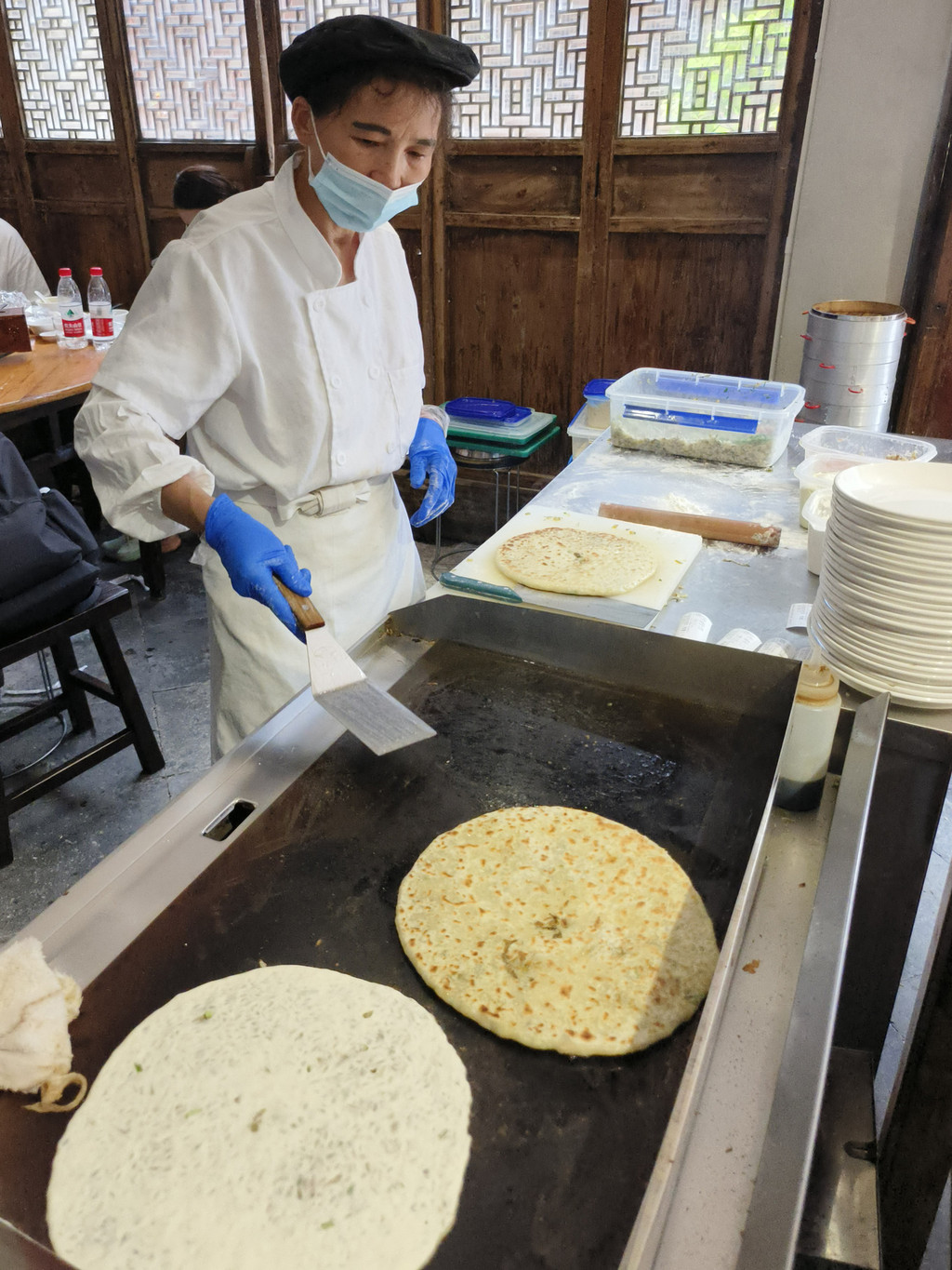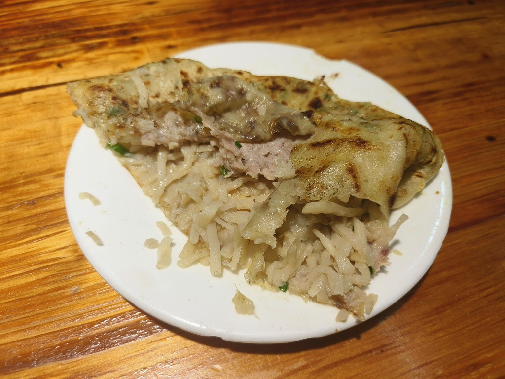 晚上尝了一下传统小吃猪肉麦饼,是一种以猪肉、萝卜丝和葱叶为馅的烙饼,稍咸,就着稀饭吃正好。一个人一碗粥(2元)一块饼(9元)就饱了。