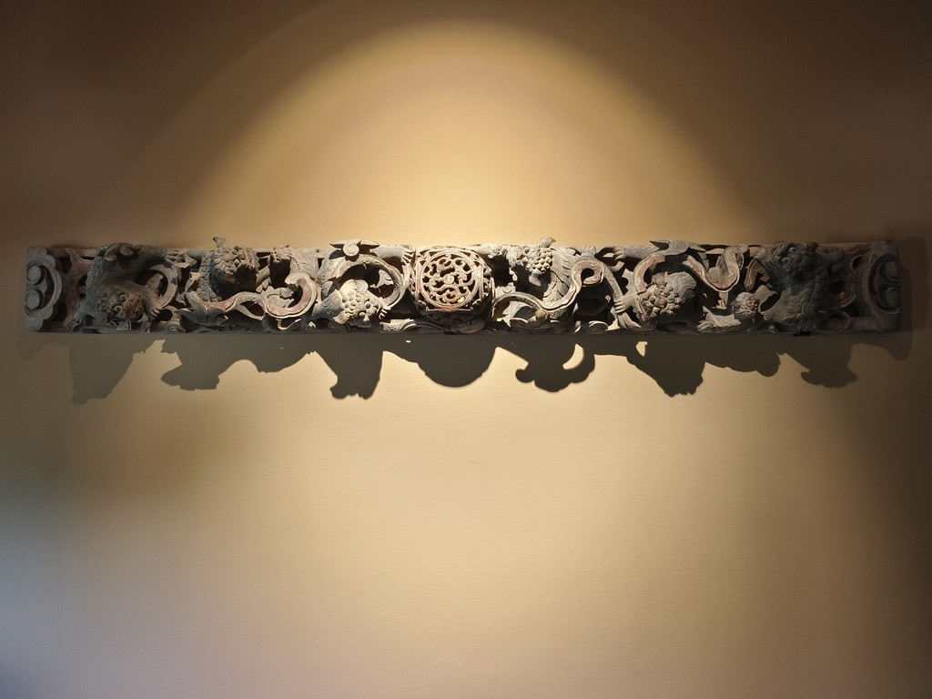 清九狮戏球木镂雕额枋。枋为古建筑构件,为两柱之间起联系作用的横木。该枋共镂雕九头神采各异的大小狮子,衔绶带戏球图案,雕工精美。狮子是中国传统瑞兽,百兽之王,象征富贵和力量,“九”与“久”谐音,“狮”与“世”谐音,九只狮子围在一起,寓意“九九归一”“九世同堂”。