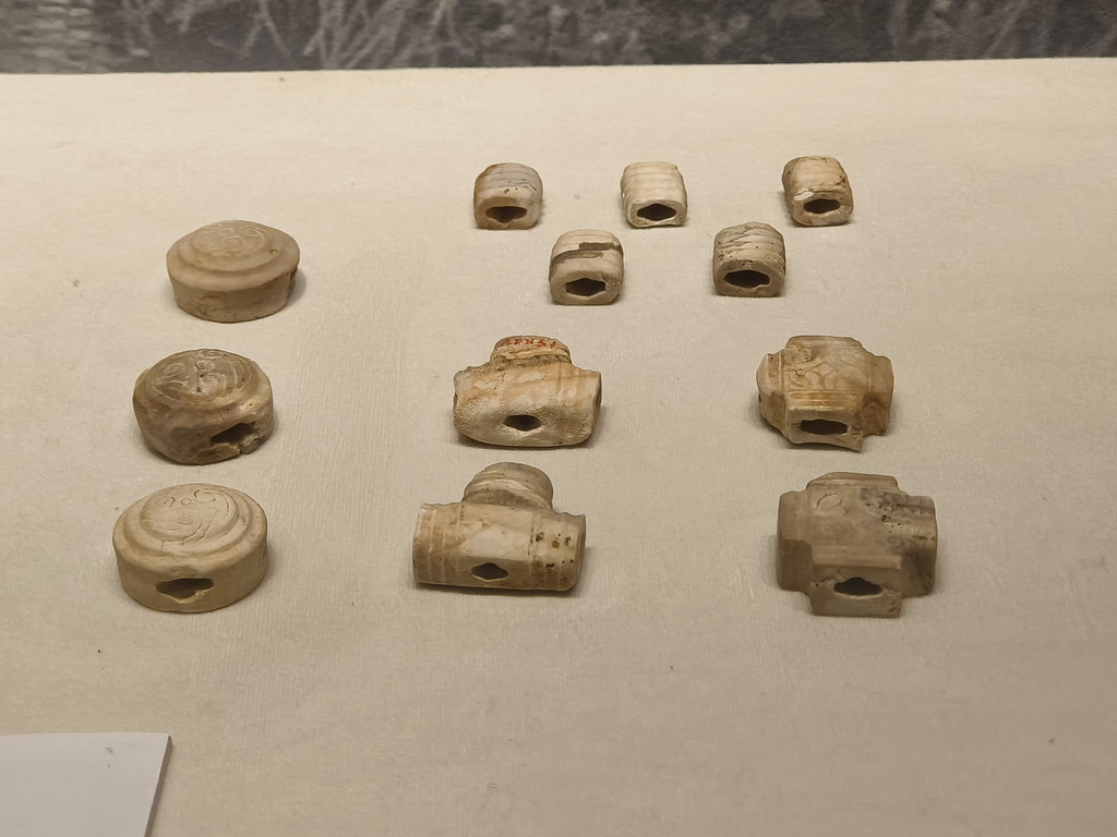 玉石节约(战国)。“节约”是一种车马器,取节制约束之意。由一个或两个空心小管组合而成,用来连接马的络头和辔带,以归拢缰绳,方便驭手调训。