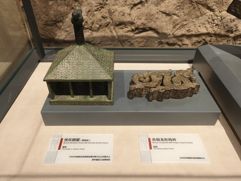 伎乐铜屋(春秋)、青铜龙形构件(战国)。伎乐铜屋是先秦时期青铜房屋模型,1982年出土于绍兴,原件藏于浙江省博物馆,这是复制品。