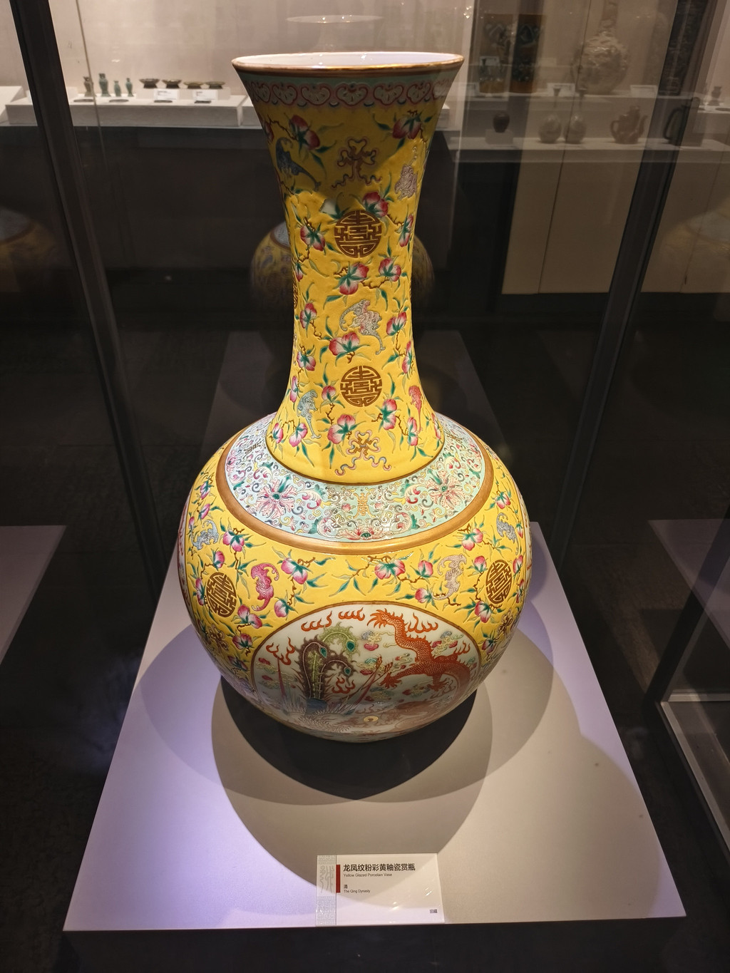 龙凤纹粉彩黄釉瓷赏瓶(清)。赏瓶是清雍正朝出现的一种造型,作赏赐之用。其器型来源于玉壶春瓶,撇口,圆腹,细长颈,肩部装饰凸弦纹。