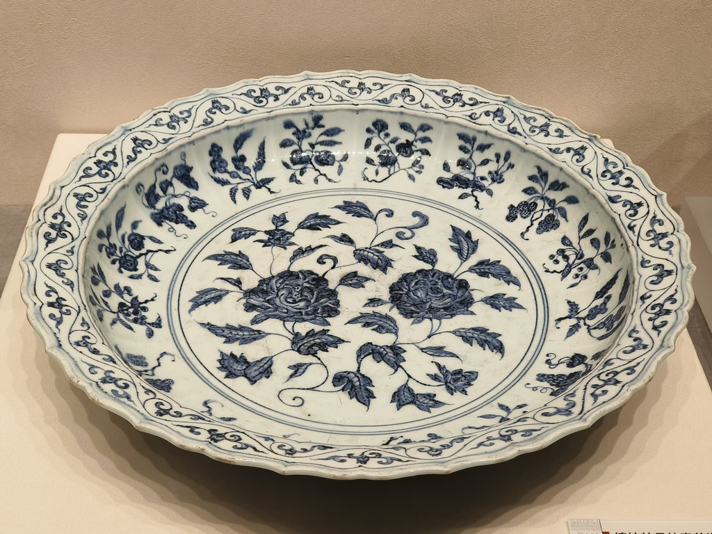 缠枝牡丹纹青釉瓷菱口盘(明·永乐)。内外均绘青花纹样,口沿绘一周缠枝灵芝纹,内外花瓣腹壁上均绘十二朵均匀排列的折枝花卉纹,盘心绘缠枝四季花卉纹。图案线条纤细流畅,疏密有序,装饰工整精致,古朴优美,是存世永乐瓷器中的珍品。