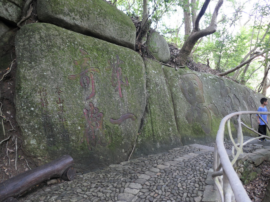 左边石刻“第一奇观”,落款为“本山界洪题,怡静宇周书”,有资料说这是宋代大书法家米芾所题;右边石刻“棲真金界”,意思是罗汉栖居的圣地,由清代某书法家所书。