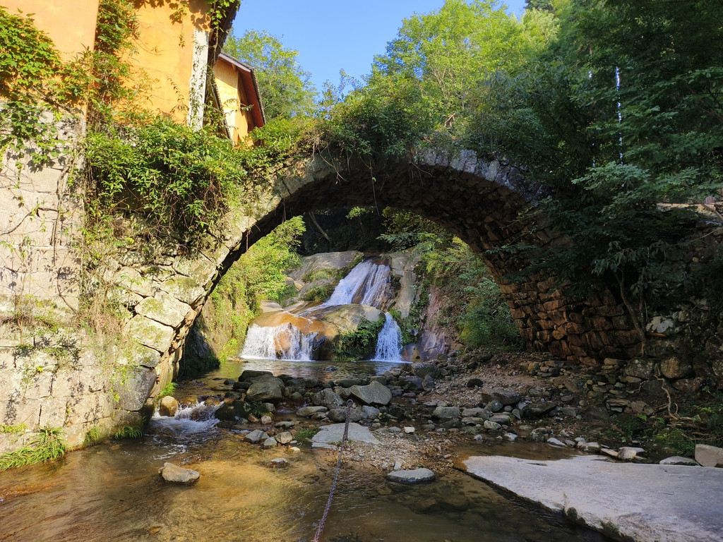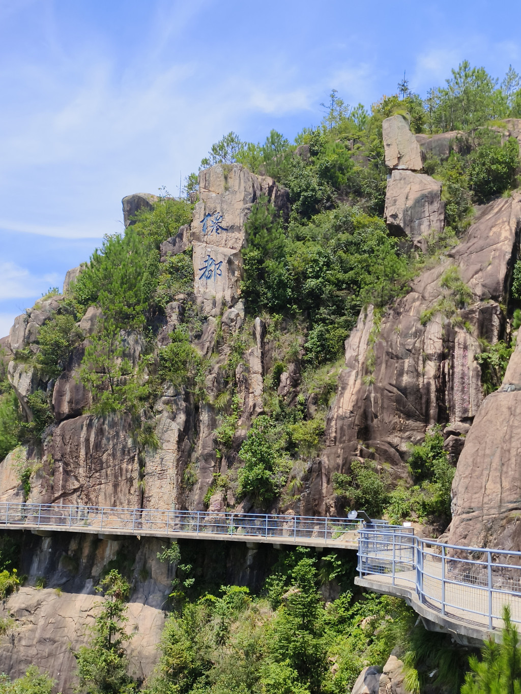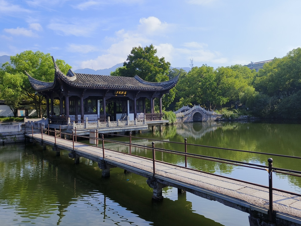 “石桥隐深树,朱阙见晴天”,唐代诗人朱庆馀所题。
