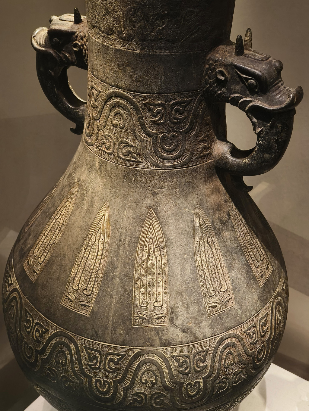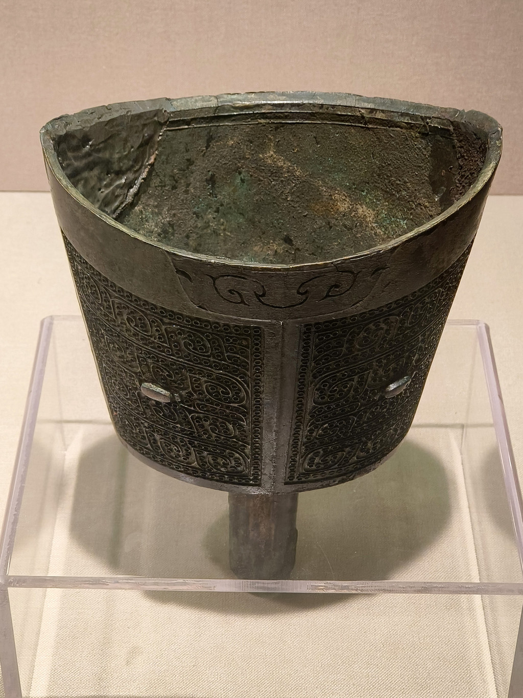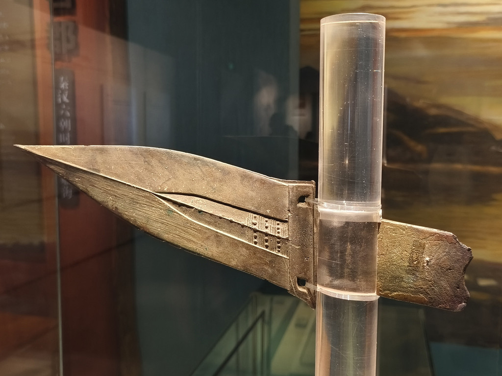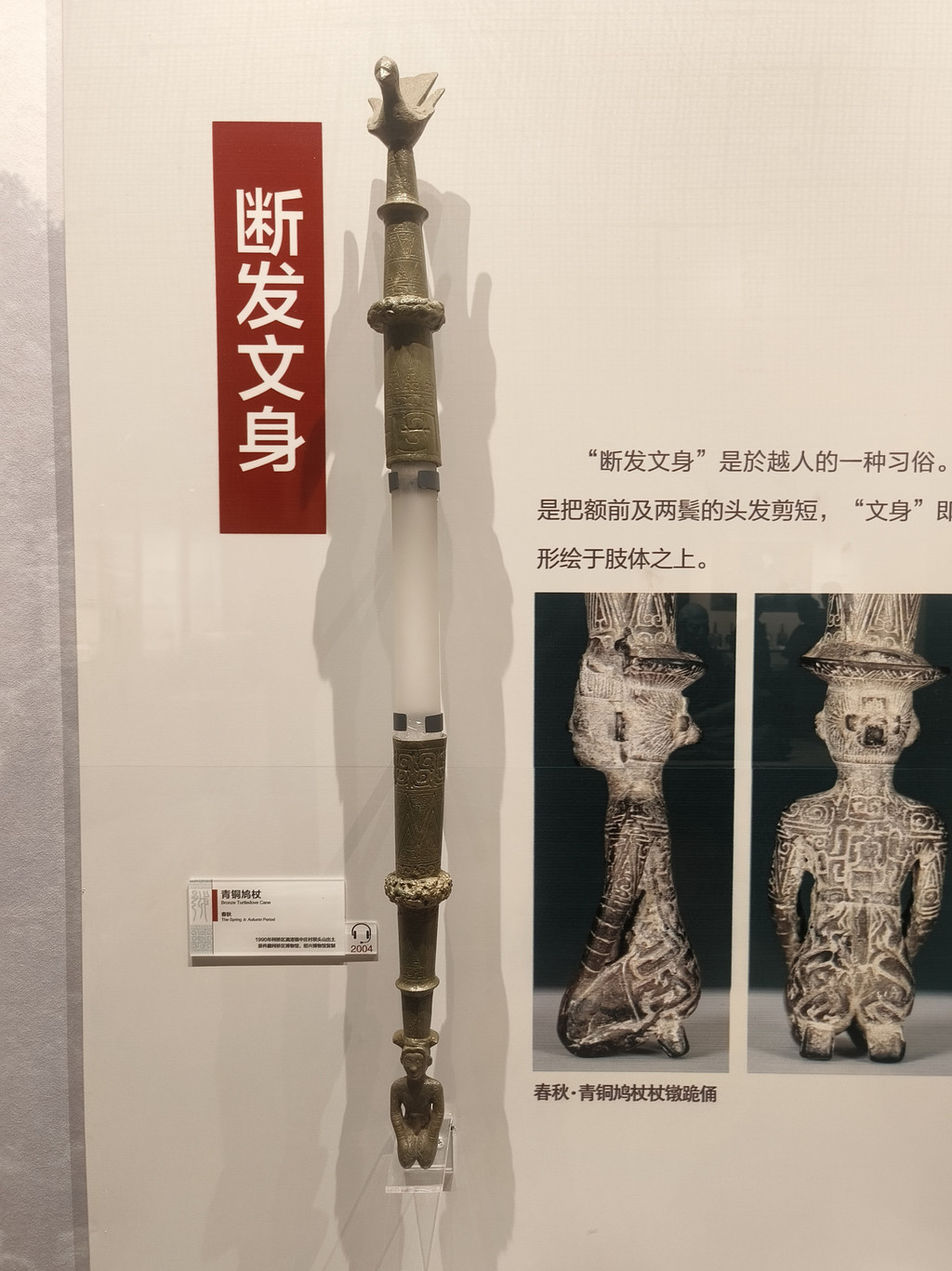 青铜鸠杖(春秋)。礼器,分杖首和杖镦两部分,由木质杖身相连。底端跪坐人像,两手放置膝部,通身有云纹及几何纹,手臂上为蝉翅纹。