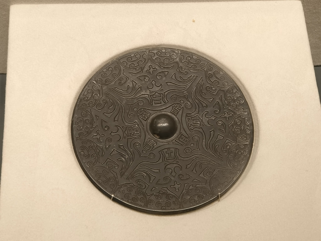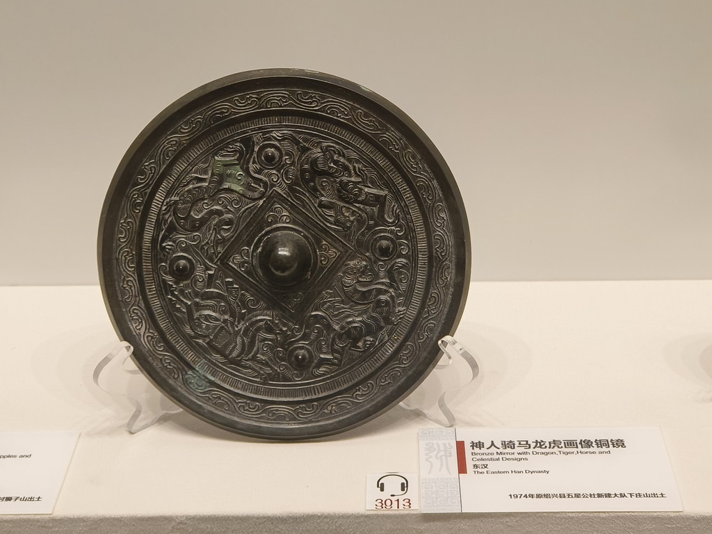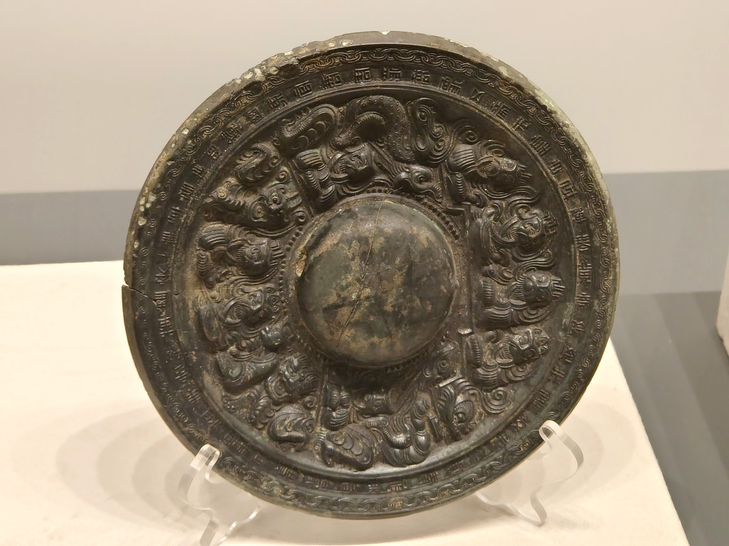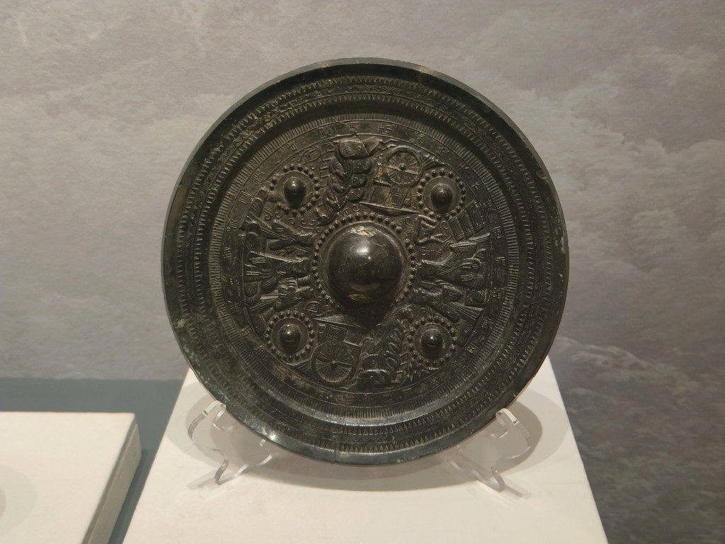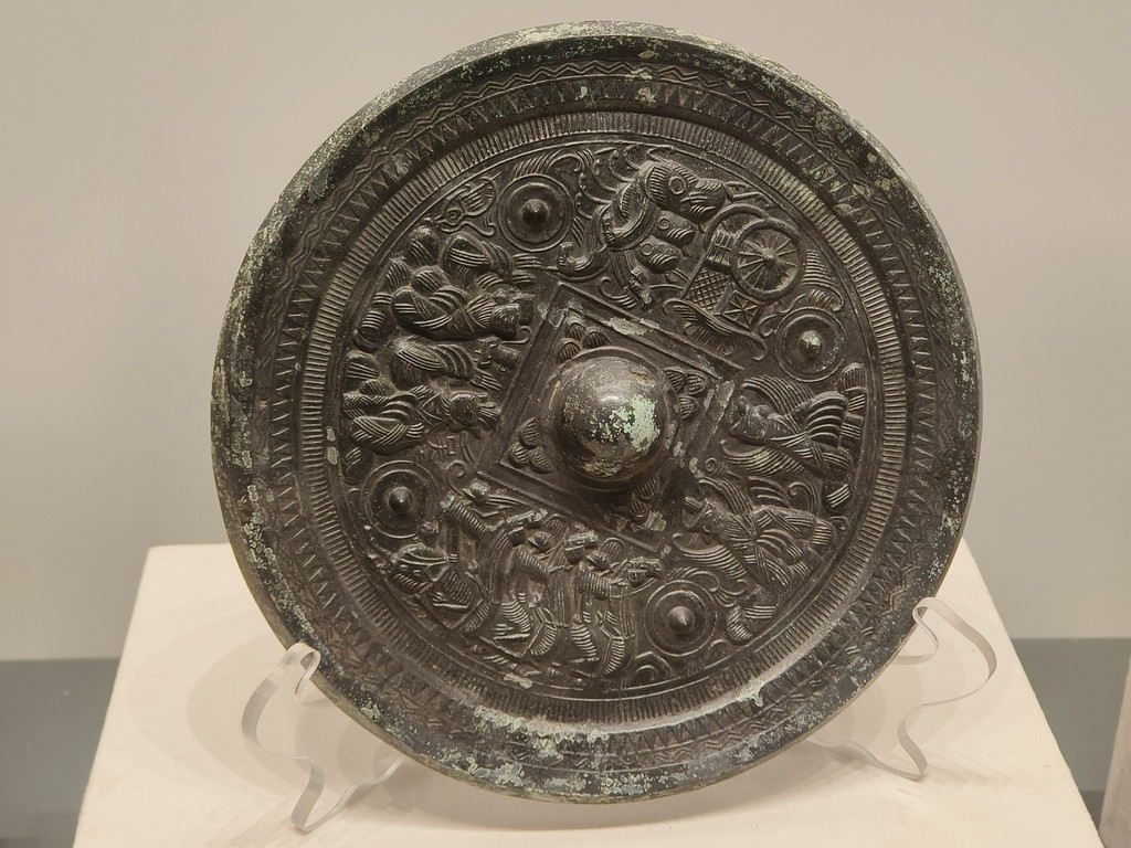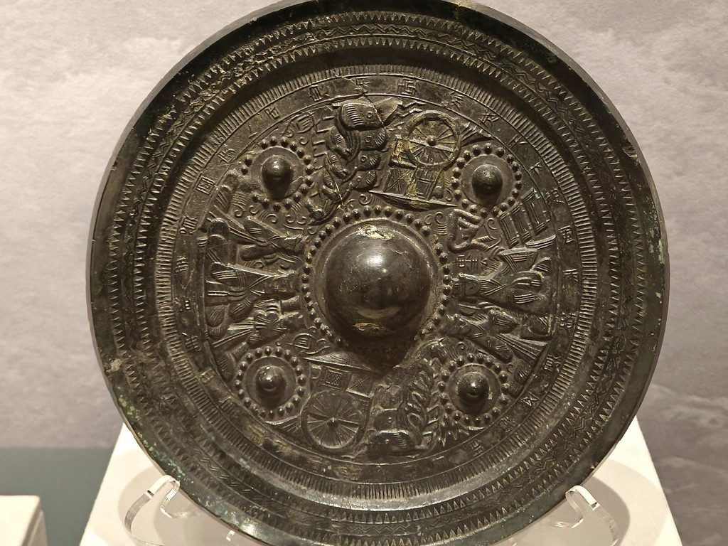 这枚直径22.5厘米的铜镜反映的是一个神话故事。远古时候有一位女子居住在昆仑山,久而久之变成仙女,与天齐寿,这就是西王母。东王公周穆王听说后,乘坐四骏马车一路往西,准备讨教长生不老之术。经过长途跋涉,终于在昆仑崦嵫山见到了西王母。此后两人相约每年在瑶池相会。