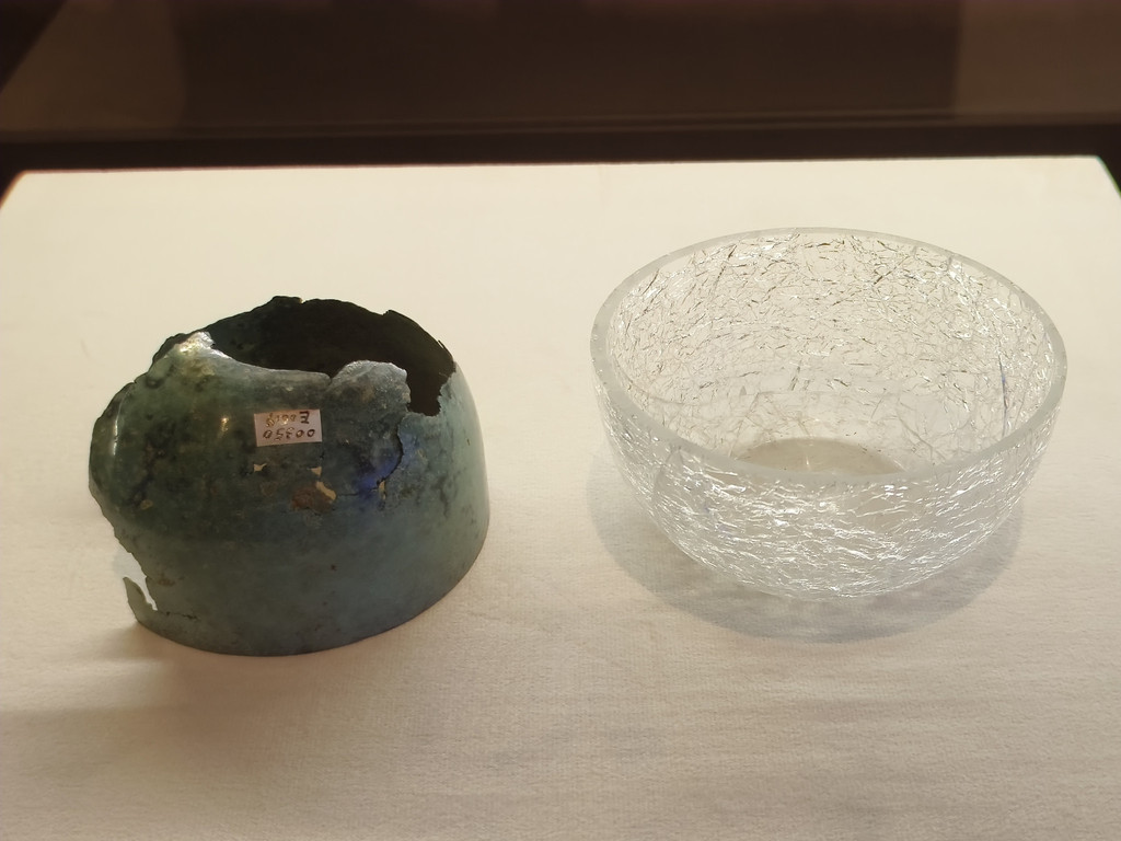 冰裂纹玻璃碗(〈附残青铜内胆〉唐—五代)。这个怎么看都是现代产品啊。
