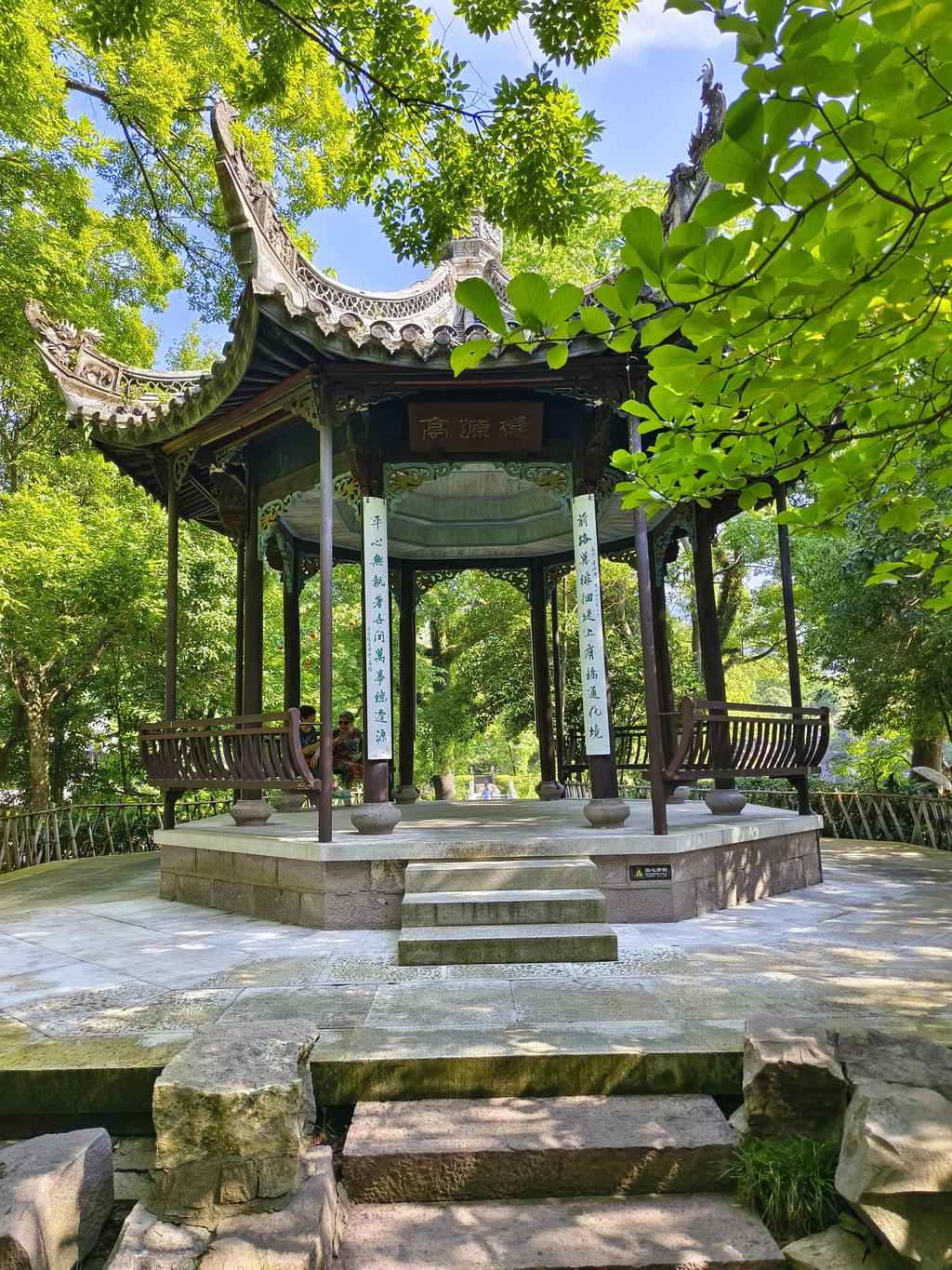 渥云亭,石柱上题有唐代诗人徐凝的诗句“银地秋月色,石梁夜溪声”。