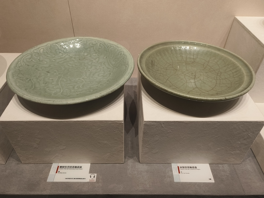 缠枝牡丹纹青釉瓷盘(明)、冰裂纹青釉瓷盘(元)