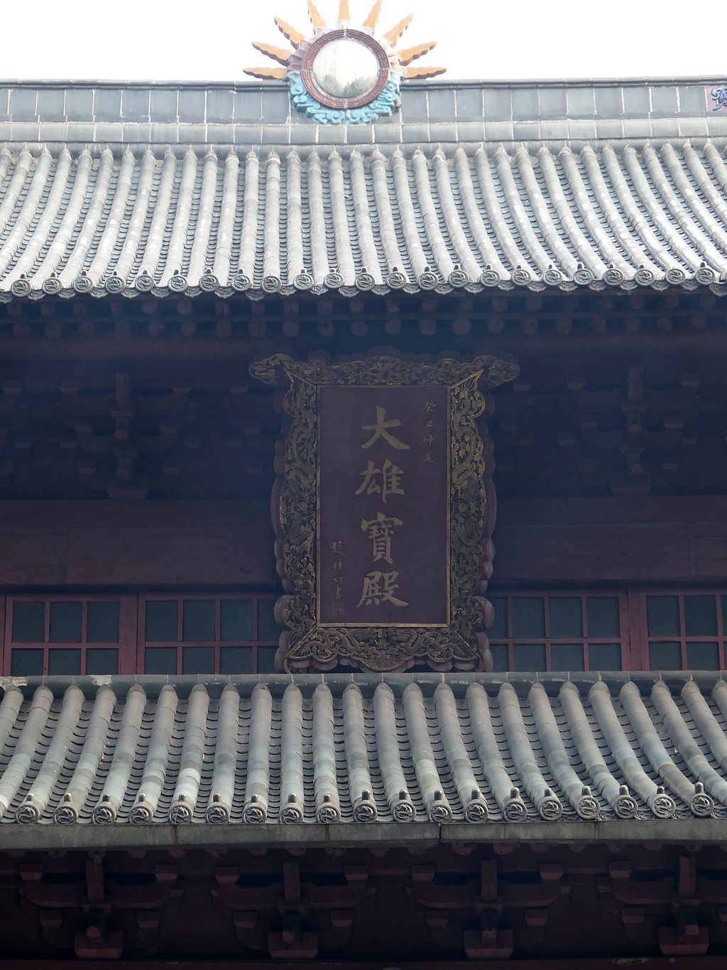 寺院主体建筑大雄宝殿。殿额“大雄宝殿”由赵朴初题写,这四个大字是竖着写的,不像其他寺庙那样横着写,表明这是皇家敕造的寺院。