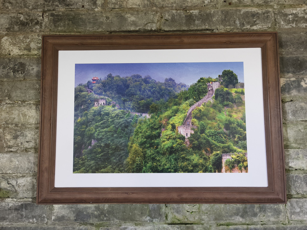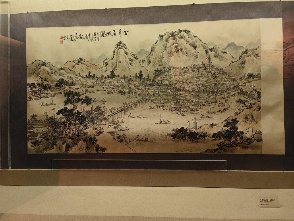 ↗清光绪吕焕章《金华府城图》(复制品),真迹藏金华太平天国侍王府。画作以全景式的构图展示了金华古城风貌:挺拔的芙蓉峰、连绵的北山山脉、高耸入云的万佛塔、横跨南北的通济桥,滔滔婺水上扁舟泛波,城墙内外寺观、楼台、民居林立……
