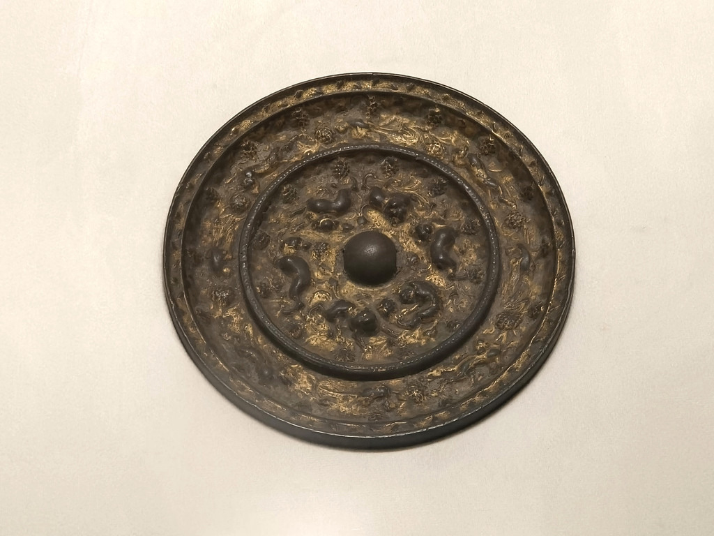 狻猊葡萄纹铜镜(唐)。狻猊(sūan ní)即狮子。东汉时期由西域通过丝绸之路传入中国。狮子是佛教中的护法神兽,象征佛法威力无穷。