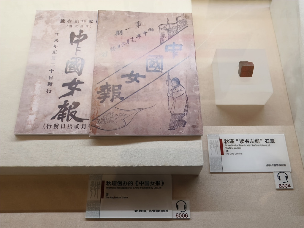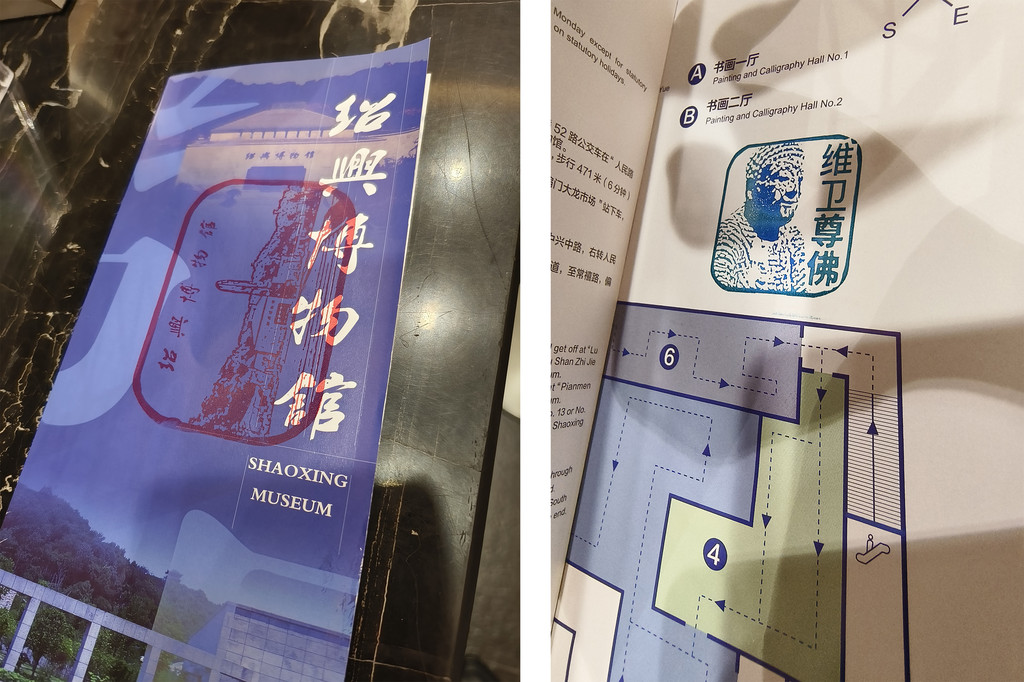 这里也有盖章打卡活动,9枚“文物章”来自9件经典文物,分别为鱼鳍形足鼎、青铜鸠杖、越王者旨於睗剑、维卫尊佛、会稽青釉瓷堆塑罐、青釉瓷羊形器、伎乐铜屋、青花连枝花蕾纹鸡心碗、鹦鹉衔绶纹铜镜。