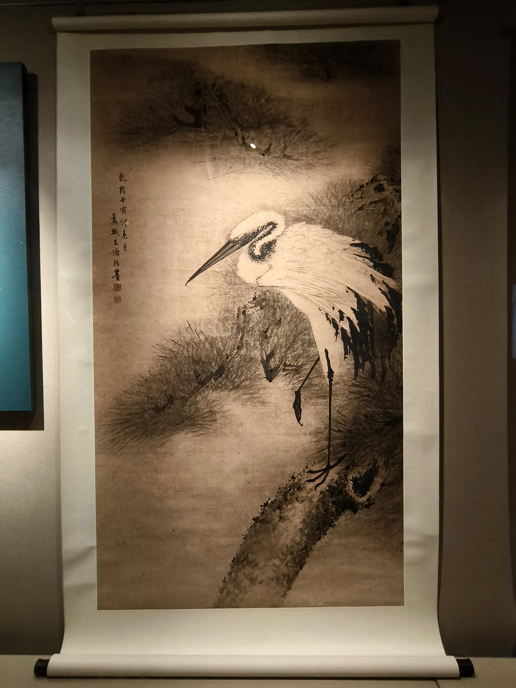 王备指墨松鹤立轴(清)。指墨画是中国画中以指代笔作画的特种绘画形式。