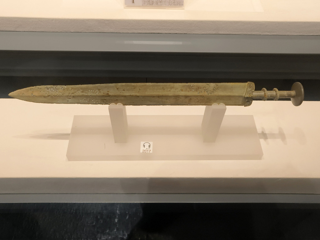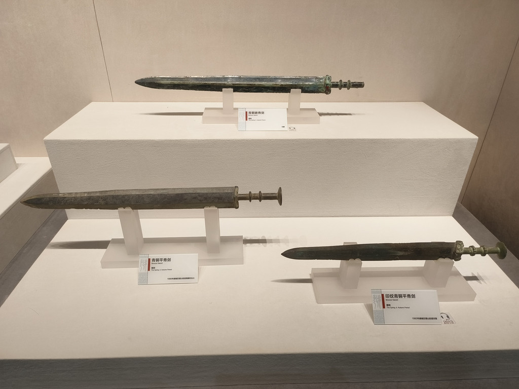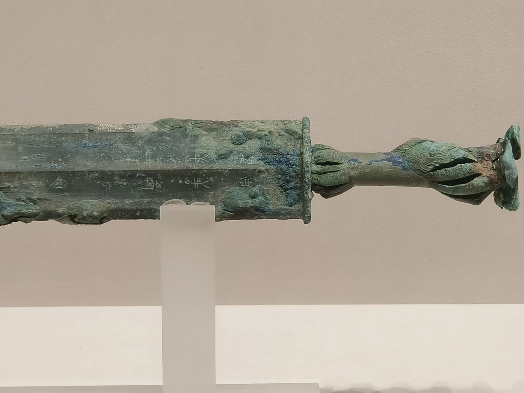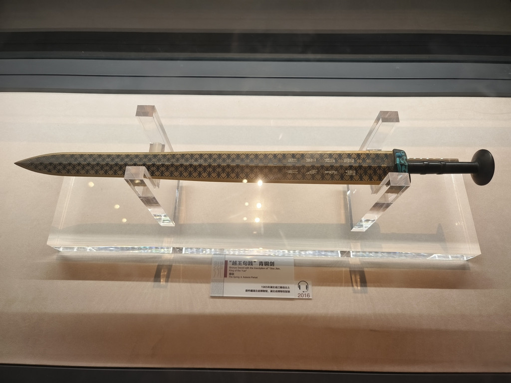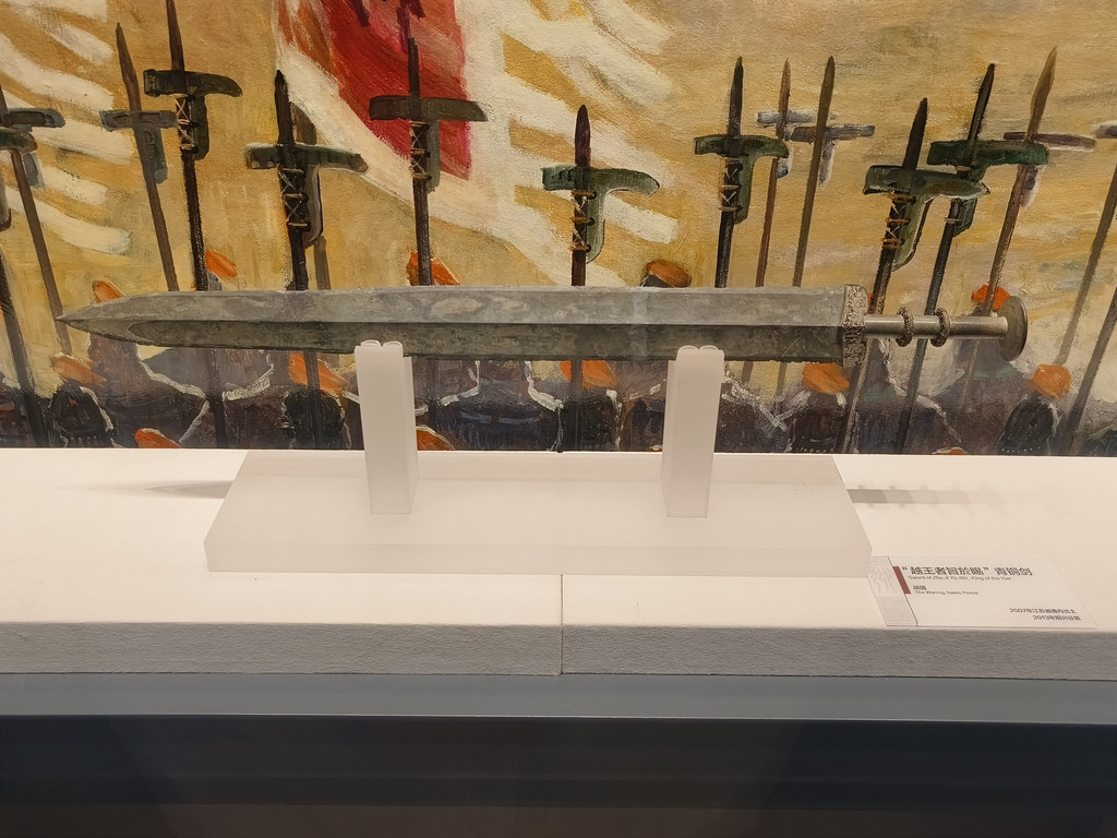 绍兴博物馆现藏有三把越王句践剑(越王者旨於睗剑、越王州句剑、越王不光剑),都是青铜材质,形制相近,但剑名和剑身铭文内容有所不同。上图为“越王者旨於睗”青铜剑。於睗是越王句践之子,文献记载中的鼫(shí)与。