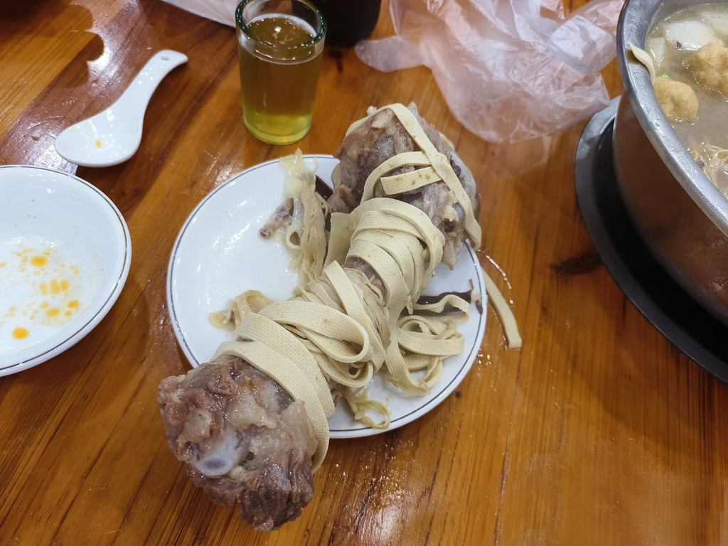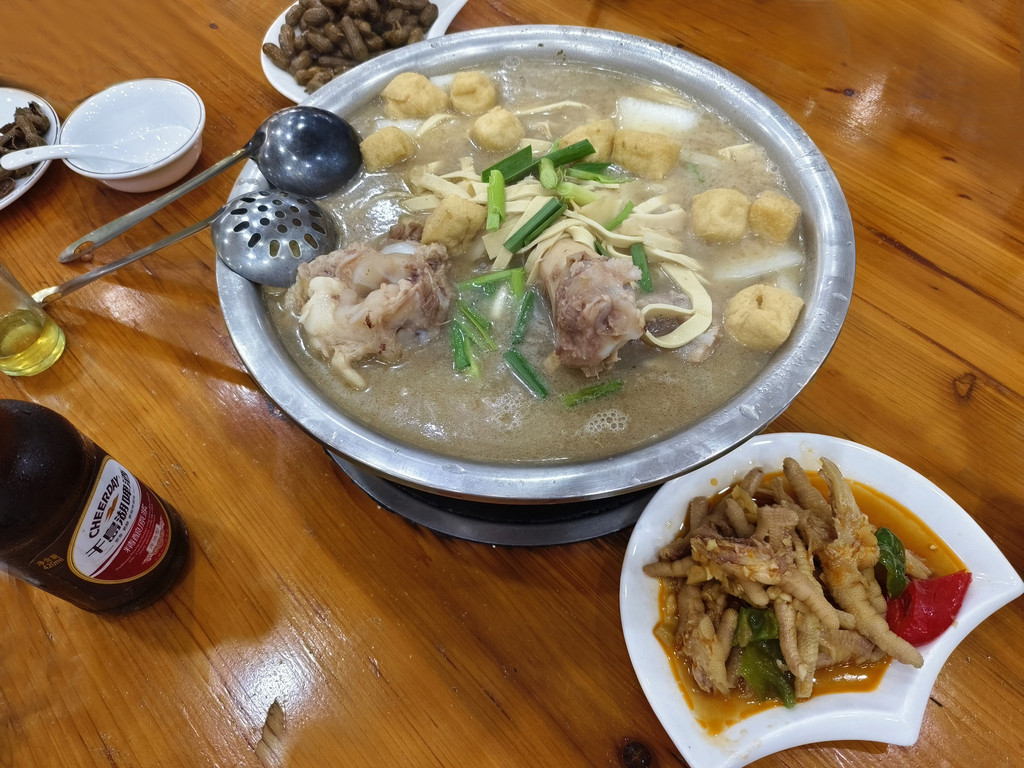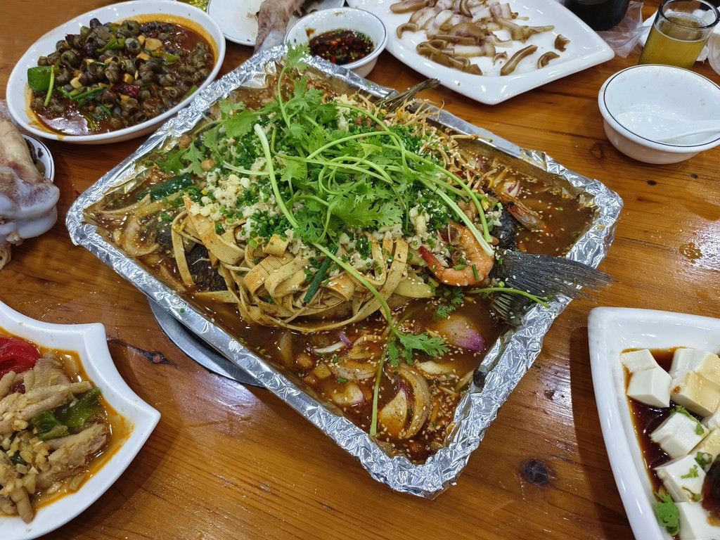 晚上品尝了当地特色“金华煲”。金华煲种类很多,有老鸭煲、胴骨煲、排骨煲、牛杂煲、鱼头煲、酸菜鱼煲等。我们点了胴骨煲,有点像火锅,主材为猪肉后腿骨、千张、腊笋,不够可以再加菜。还要了一份烤鱼,总体口味都偏重,但吃完不上火、口不干。