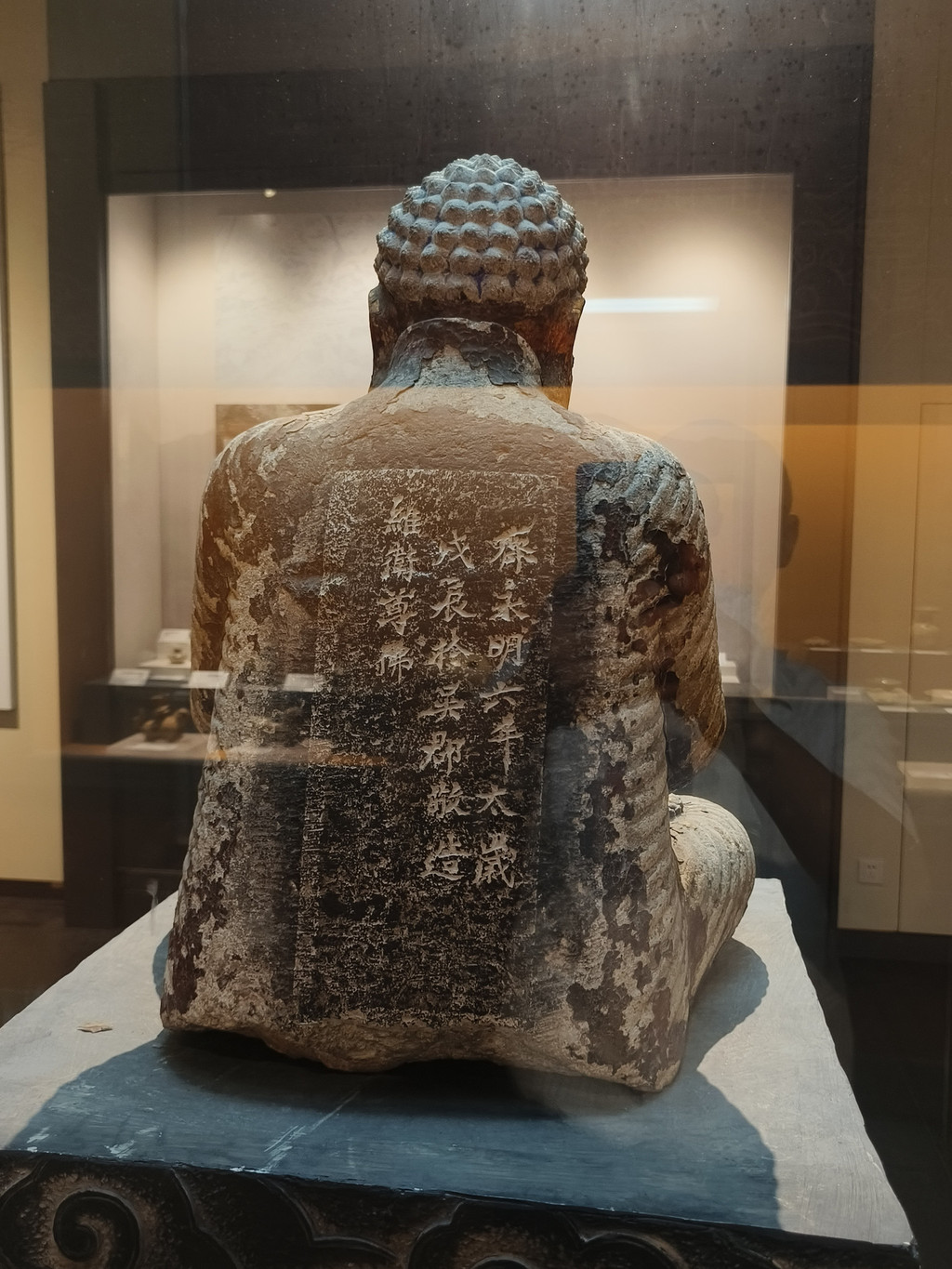 “齐永明六年”维卫佛像(南朝·南齐)。维卫佛是佛教小乘教七佛之首,注重个人修行,在江南一带颇为盛行。佛像庄严慈祥,服饰依稀可辨,背后镌刻铭文“齐永明六年太岁戊辰,于吴郡敬造,维卫尊佛”。