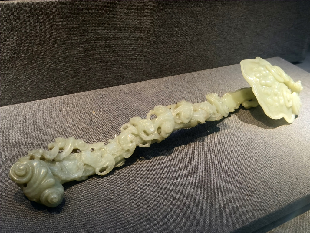 明镂雕蝙蝠纹玉如意。如意俗称“爪杖”,手不能到达之处可代劳搔痒,尽如人意。