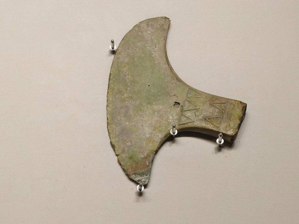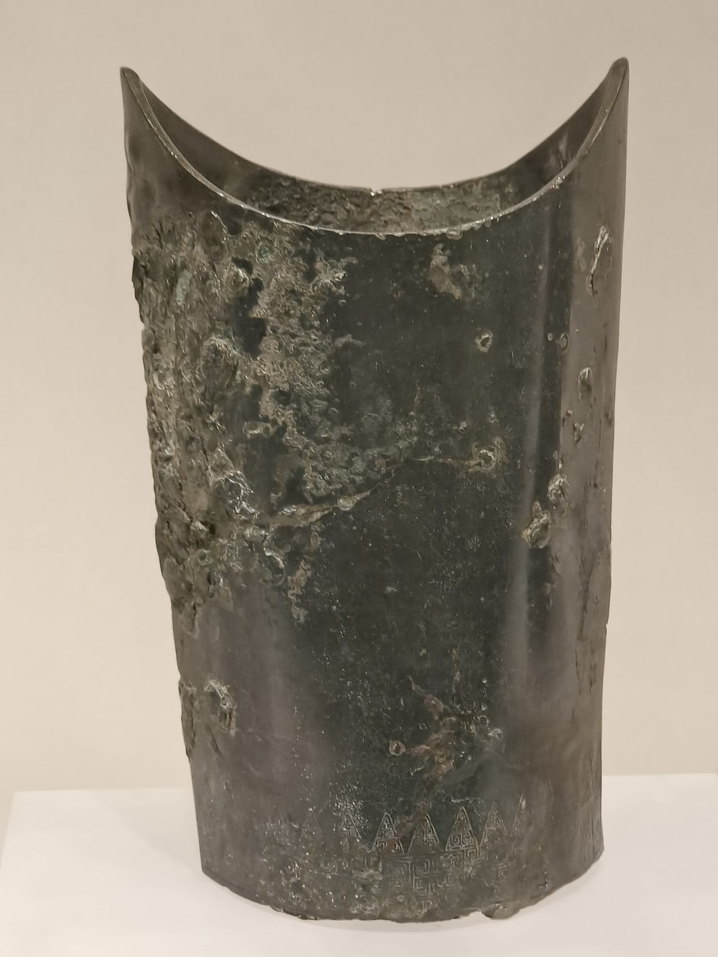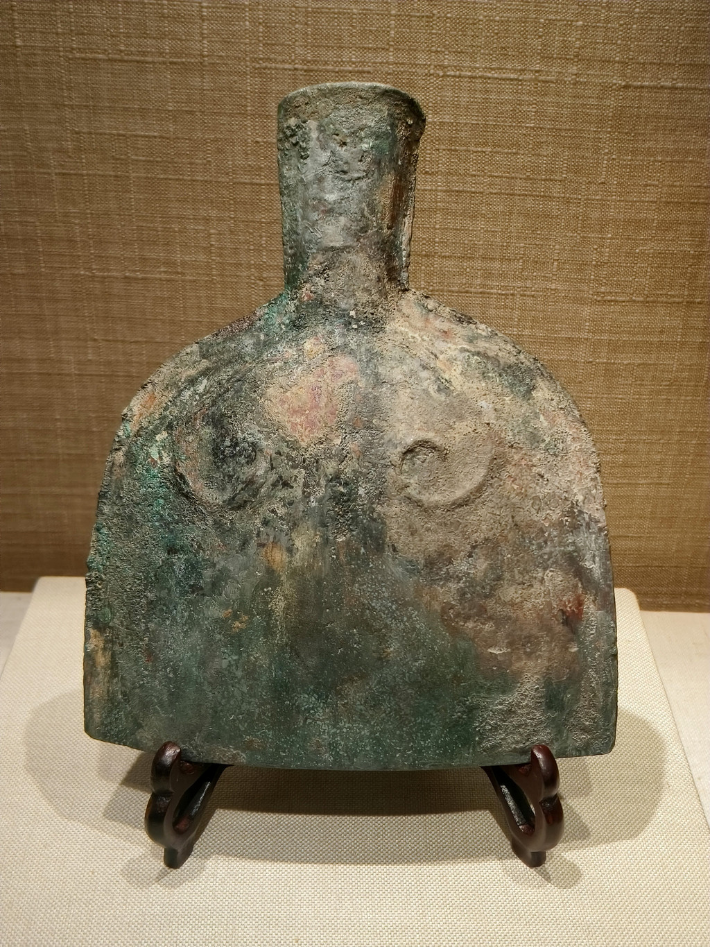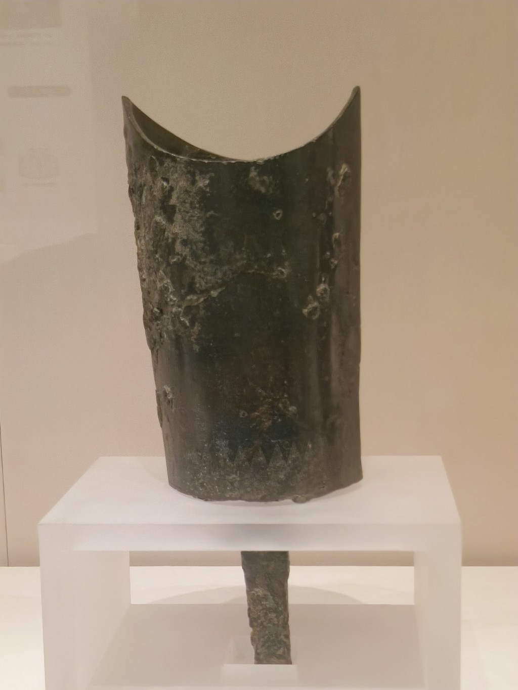 “配儿”青铜勾鑃(春秋)。勾鑃(diào)是钲的别称,与铙、镈、钟一样都是打击乐器。器物上刻着主人名字“配儿”,即吴王阖闾的太子、吴王夫差的兄长。1977年出土于绍兴,共两件,一件收藏在浙江省博物馆,另一件在绍兴博物馆。但请问一下,这到底是不是原件,为何找来找去,找了半天,也找不到“配儿”两个字。