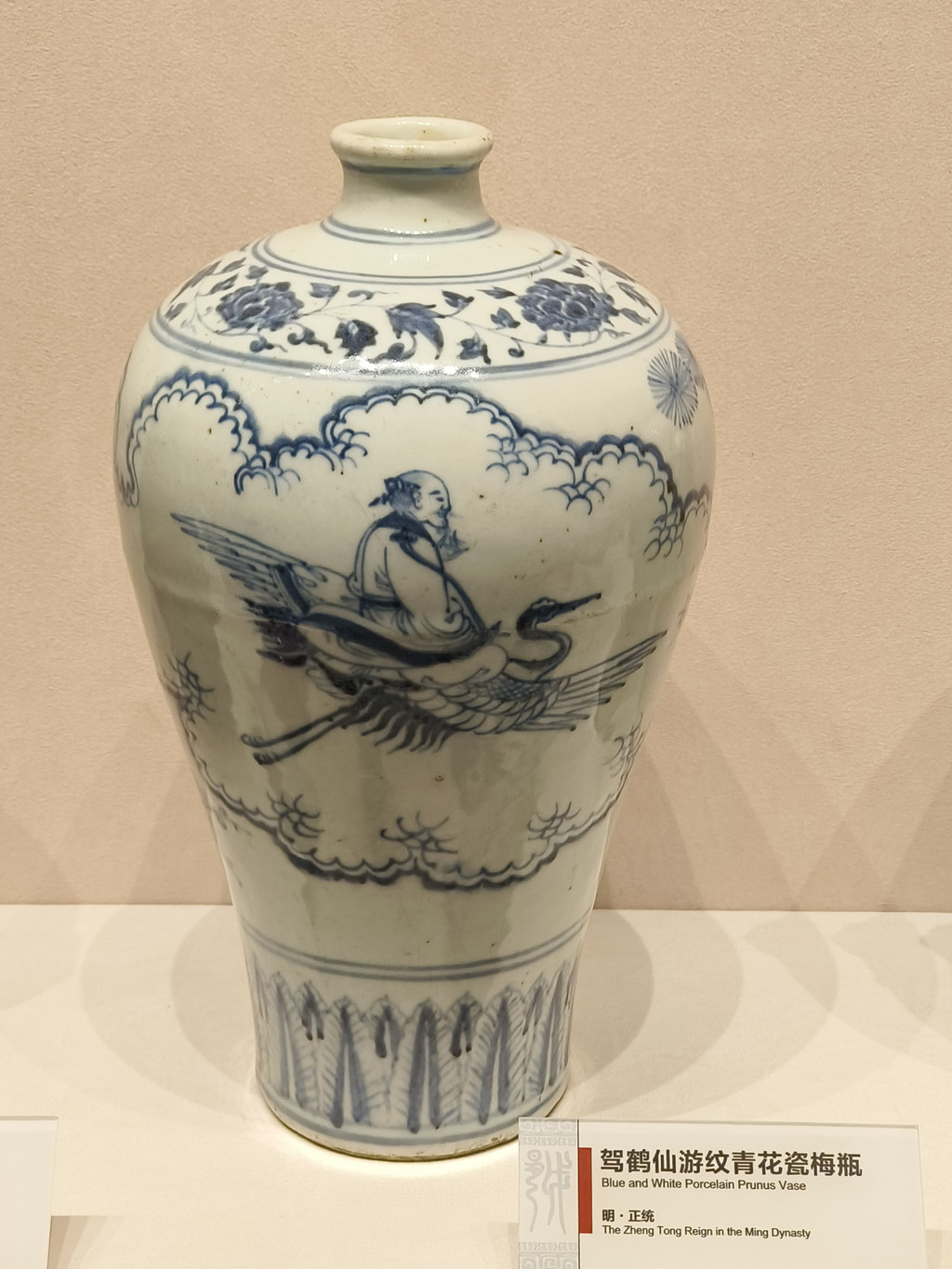 驾鹤仙游纹青花瓷梅瓶(明)。肩部绘青花缠枝牡丹。腹部青花图案一面为“驾鹤仙游”,云团中一仙人悠然盘坐于展翅飞翔的鹤背上;另一面为松、竹、梅“岁寒三友”图。下腹端绘青花蕉叶纹。