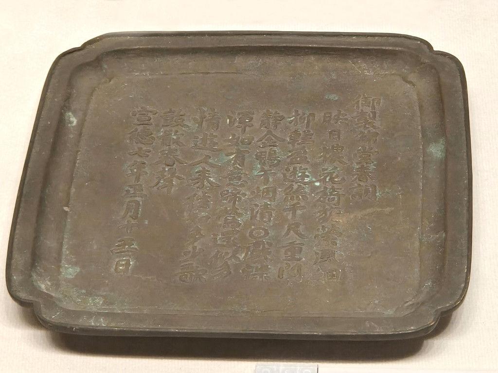 铭诗文铜委角方盘(明)。委角也称“倭角”,是一种用于方形盘、盒、瓶等器物的装饰形式,有的是将直角变为内凹双弧线或圆角,也有的是将直角斜削45度,变四方形为八角形。该盘有64字铭文“御制锦堂春词:映日秾花旖旎,荣风细柳轻盈。游丝千尺重门静,金鸭午烟清戏蝶,浑如有意,啼莺还似多情。游人来往知多少,歌鼓散春声。宣德七年正月十五日”。