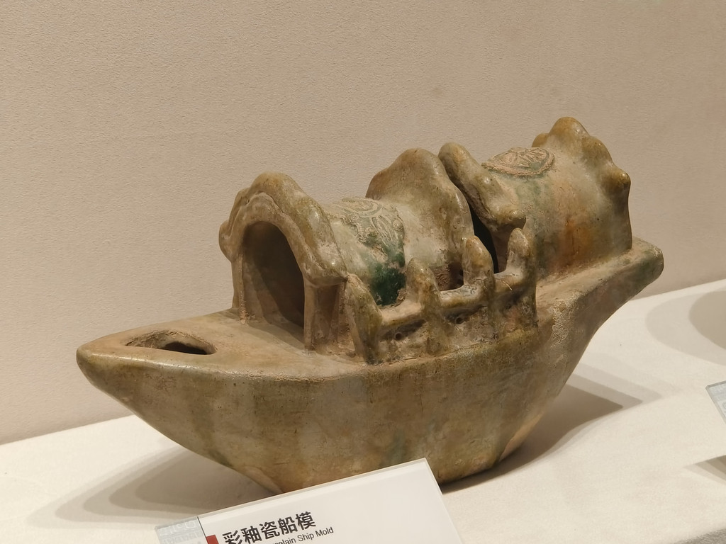 彩釉瓷船模(南宋)。这是一个文房用具,用于向砚中滴水以磨墨,也可视为船模。平底,前端有一个三角形小孔,中部和尾部有两个卷篷,两侧设有镂空栏板。