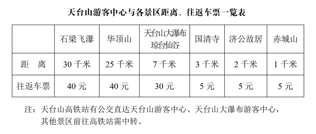 天台山风景区位于台州市天台县,是国家5A级旅游区,由天台山大瀑布、琼台仙谷、石梁飞瀑、国清寺、赤城山、济公故居、华顶森林公园等七个景区组成。景区之间有一定距离,自由行游客可从天台山高铁站乘7路公交车到天台山游客中心(半个小时一班),再由游客中心乘景区接驳车到各景区。游客中心到各景区的距离:赤城山1千米、济公故居2千米、国清寺3千米、天台山大瀑布+琼台仙谷7千米、华顶森林公园25千米、石梁飞瀑30千米。提醒三点:一是除了天台山游客中心(总游客中心),大瀑布、石梁景区也有自己的游客中心(分游客中心),不要搞混了;二是天台山高铁站只有到天台山游客中心、大瀑布游客中心的直达公交,单程时长分别为50分钟、30分钟,其他景区前往高铁站需中转;三是景区接驳车只能在现场买票,携程等OTA不卖车票、只卖门票。买票时要问清楚多长时间一班,最晚什么时候返回。