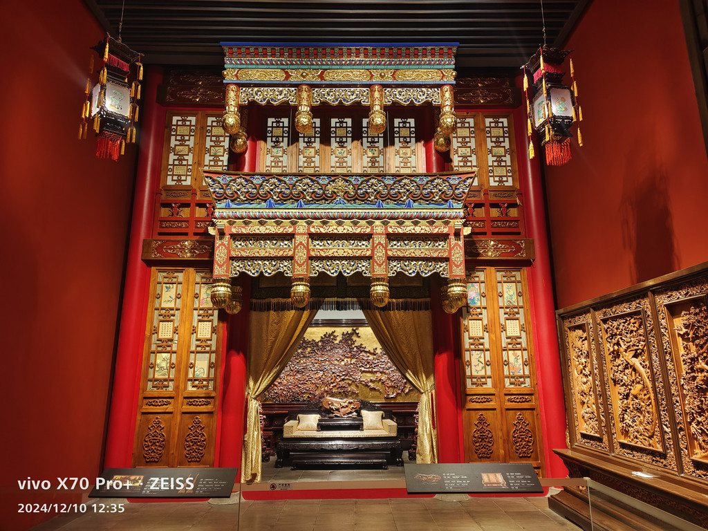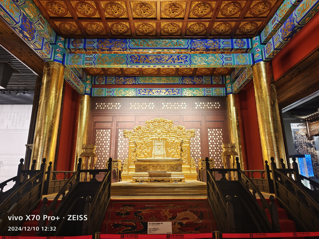 在博物馆的中庭,还陈列着一件重器,那就是上面这把仿制的至尊宝座龙椅。整个龙椅由上千块精细雕刻的木部件组成,各种形态的龙数不胜数,每个连接处都用榫卯连接。施以金箔罩漆、金碧辉煌。