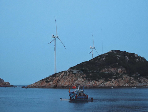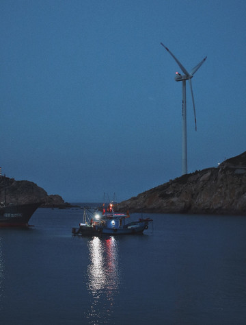几经折腾总算逃离,大部分游人都会选择在环岛北路的后内沙滩看风车,我们直接将车开到了后澳宫附近的海湾,此时,天色已晚,头上就是巨大的风车,不停地闪着光,渔船陆续通过风车岛返回港湾,蒙蒙夜色下一片宁静祥和。