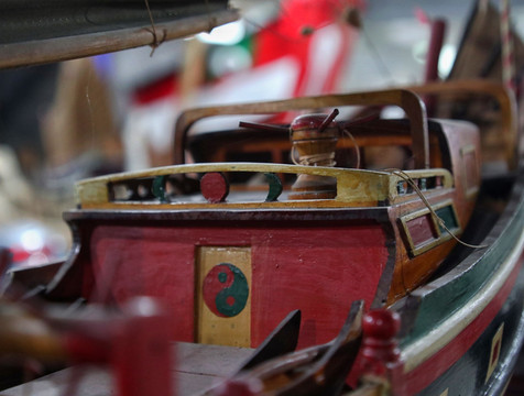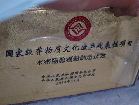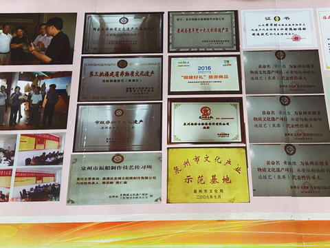 在中心,林主任向我们展示了福船的国家级非遗证书以及各种获奖奖牌,在临时的空间里,各种大小展品排列比较密集,而尺寸较大的福船也被其他博物馆借去展览了,几位老人正在制作缩小版的福船模型,全是手工制作。林主任说,等中心修缮完毕便会改善许多。