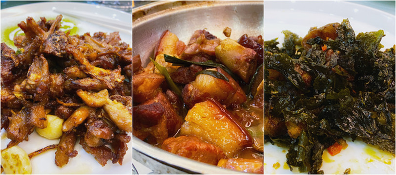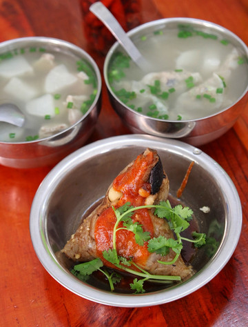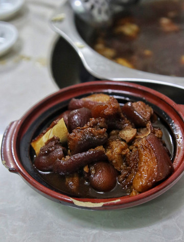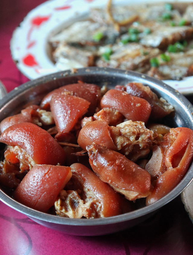 和老板娘闲聊中得知,原来这家饭店不需要点菜,是按着人头算的,四个人就上四个人的量,老板娘安排的,一个人过来还不给做呢。本着来都来了,那就吃吧的原则开动起来。涂岭猪脚声名远扬,为此当地还举办一年一度的猪脚节。涂岭猪脚是以白糖生姜等调料与猪脚同煮,或炖或煲,约30-60分钟,煮到猪脚入味,皮弹肉嫩,入口即化,加上小鱿鱼干的做法和 厦门 这边也很像,口味真的没得说,即使汤汁浇饭都觉得香,还有一个带鱼也很不错。