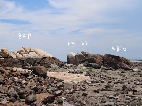 临别时,林主任告诉我们可以到山下的滩涂一睹峰尾卧佛的风采,是不久前才发现的自然景观。沿着福船后面的小路一路往下开,再步行一小段便来了到滩涂,在岸上看了半天没有看到,下到滩涂果然一尊头戴冠的半身躺佛出现在面前,面部轮廓明显,惟妙惟肖。据说这片沙滩还有佛手石、螃蟹石等,可惜没有找到,到是我们几个在另一个角度发现卧佛上的一个小和尚,不知道是不是首次发现?像不像大家说看看嘛。