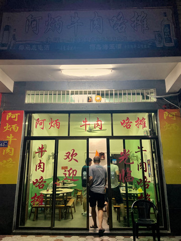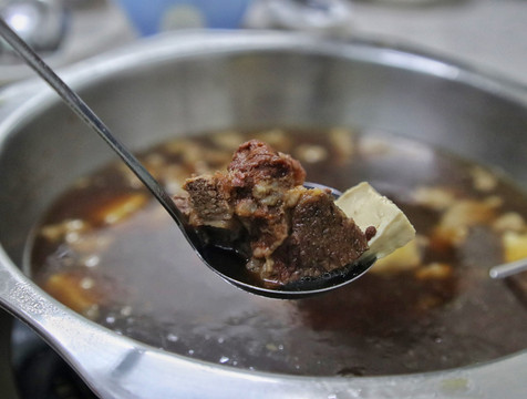 阿炳牛肉咯摊是 永春 朋友推荐的,去之前就已经打电话安排好。到五里街的时候,这地方竟然完全没下过雨,八点多小城镇街上就没有人了,到店里老板把准备好的菜摆了满满一桌。牛肉咯摊是深色的,牛肉大块,热腾腾地捞出来,鲜嫩多汁,果然名不虚传。这锅锅底还可以拿来汆烫其他食材,非常美味。
